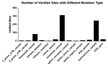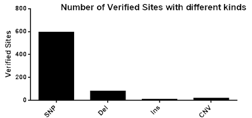 表1. 泛腫瘤相關靶向基因部分展示 3. 染色體全覆蓋,除了Y染色體外,其他染色體都有涉及; 圖1. 在不同染色體編號上的位點數(shù)(經過驗證的位點) 4. 變異種類多:涉及SNP,deletion,insertion,CNV等等; 圖2. 不同種類突變形式的位點數(shù)(經過驗證的位點) 5. 突變頻率全覆蓋,從1%-100%,各區(qū)間都有涉及; 圖3. 不同突變頻率的位點數(shù)(經過驗證的位點) 6. 突變類型全覆蓋,有UTR區(qū)域,有內含子,有外顯子,有錯義突變,有同義突變,有供體變異等等; 圖4. 突變細分種類的位點數(shù)(經過驗證的位點) 7. 位點多,超過680個位點,全部有對應的Cosmic ID或/和dbSNP ID注釋; 圖5. 經過dbSNP ID和Cosmic ID注釋的位點數(shù)(經過驗證的位點) 8. 多平臺驗證,數(shù)據(jù)準確可信賴; 8.1 其中1000x panel驗證16個位點,panel為知名商業(yè)化公司產品; 表2. 16個經過1000x NGS-Panel試劑盒驗證的位點信息 8.2 DdPCR驗證8個位點,Bio-Rad QX200和Bio-Rad原裝試劑 表3. 8個經過DdPCR(bio-rad)試劑盒驗證的位點信息 8.3 500X WES驗證所有位點,IDT xGenExome Research Panel v1.0捕獲,HiSeq X-TEN測序 表4. 500X WES驗證的400個基因信息 9. 基因覆蓋科學,超過400個基因,覆蓋國內外多個知名panel的設計; 表5. 基因覆蓋率比較 免費試用活動開始了,感興趣的親們可以聯(lián)系我們4008-750-250 |