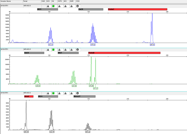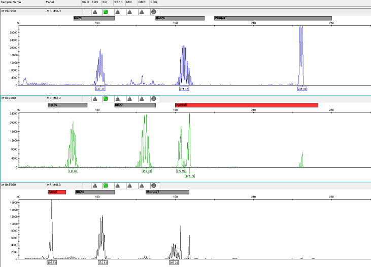 微衛(wèi)星是人類基因組的一段串聯(lián)重復(fù)序列,一般在1~6bp之間,又被稱作短串連重復(fù)(Short Tandem Repeats,STRs)或簡單重復(fù)序列(Simple Sequence Repeat,SSRs)。 微衛(wèi)星不穩(wěn)定(Microsatellite Instability,MSI)指的是微衛(wèi)星重復(fù)次數(shù)減少或者增加,微衛(wèi)星不穩(wěn)定的內(nèi)在機制是錯配修復(fù)(MMR)系統(tǒng)失調(diào),從而限制了糾正微衛(wèi)星自發(fā)的長度改變的體細胞突變的能力,體細胞突變積累,最終形成MSI。