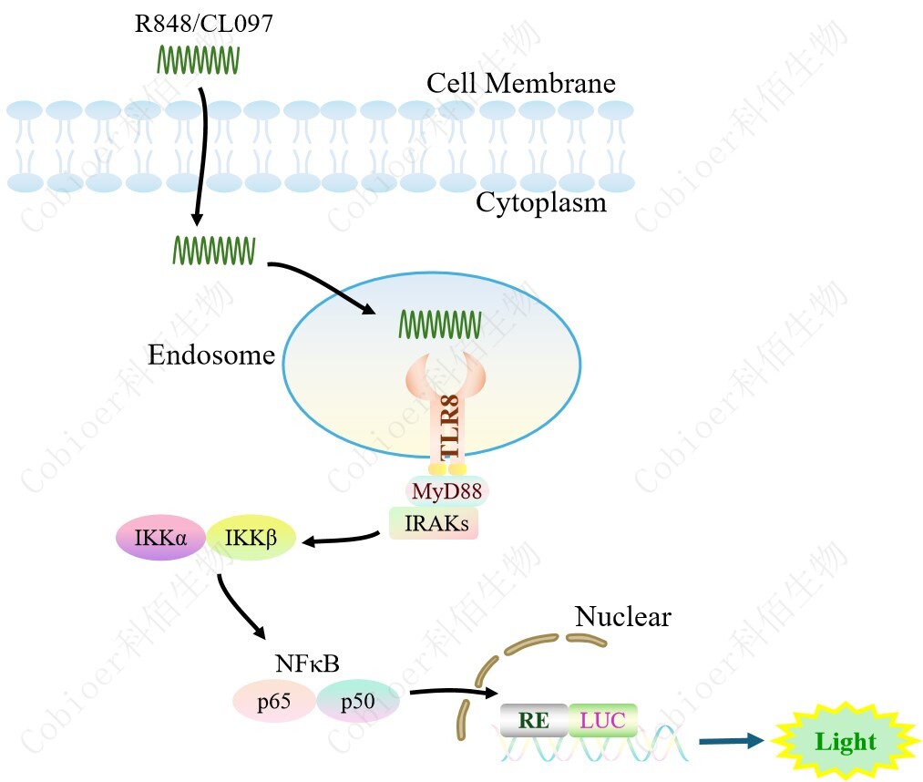 TLR8 NFκB-Luc HEK293 報(bào)告基因藥靶模型很好的模擬了體內(nèi) TLR8 的信號(hào)轉(zhuǎn)導(dǎo)過程, 原理見下圖所示。