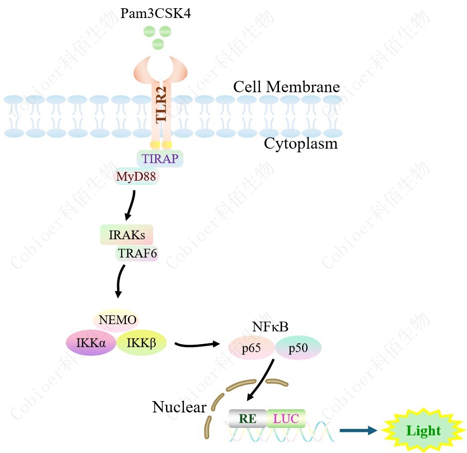 TLR2 NFκB-Luc HEK293 報(bào)告基因藥靶模型很好的模擬了體內(nèi) TLR2 的信號(hào)轉(zhuǎn)導(dǎo)過程, 原理見下圖所示。
