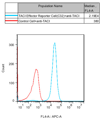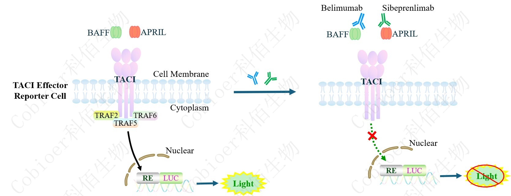 TACI Effector Reporter Cell 報(bào)告基因藥靶模型很好的模擬了體內(nèi) TACI 的信號(hào)轉(zhuǎn)導(dǎo)過程, 原理見下圖所示。![]() Figure 1. TACI Effector Reporter Cell 模型原理圖 |