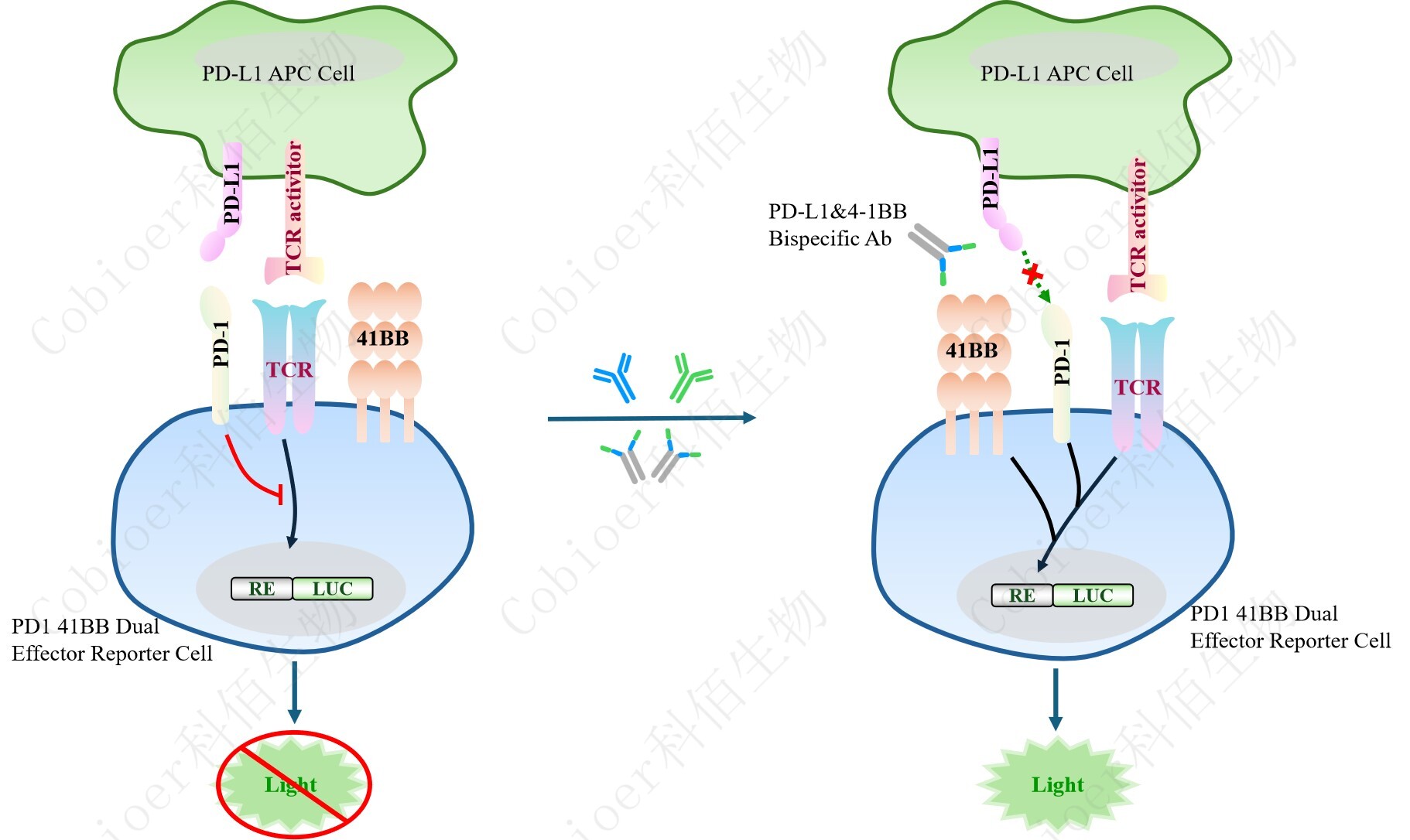 PD1 4-1BB Dual Effector Reporter Cell 報(bào)告基因藥靶模型很好的模擬了體內(nèi) PD1&4- 1BB 的信號轉(zhuǎn)導(dǎo)過程,原理見下圖所示。