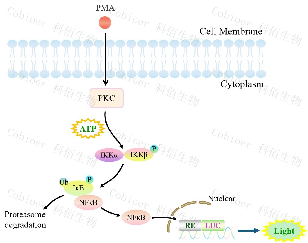 NFκB-Luc Jurkat 報(bào)告基因細(xì)胞是由 NFκB 調(diào)控并表達(dá) Luc 熒光素酶報(bào) 告基因的 Jurkat細(xì)胞。PMA 是 DAG(二酯酰甘油)的類似物,可自由的通過(guò)細(xì)胞膜,直接 作用于細(xì)胞活化信號(hào)轉(zhuǎn)導(dǎo)通路上的 PKC,原理見(jiàn)下圖所示。![]() Figure 1:NFκB-Luc Jurkat 細(xì)胞模型原理圖