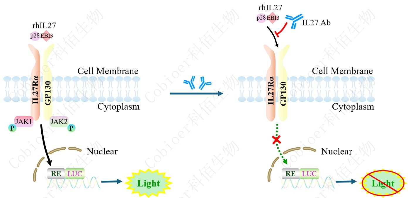 IL27 Effector Reporter Cell 報(bào)告基因藥靶模型很好的模擬了體內(nèi) IL27 的信號(hào)轉(zhuǎn)導(dǎo)過(guò)程, 原理見(jiàn)下圖所示。![]() Figure 1. IL27 Effector Reporter Cell 細(xì)胞模型原理圖 |
