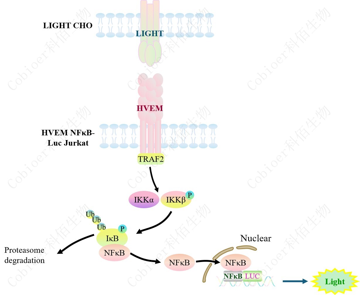 HVEM NFκB-Luc Jurkat 報(bào)告基因藥靶模型很好的模擬了體內(nèi) HVEM 的信號(hào)轉(zhuǎn)導(dǎo)過(guò)程, 原理見(jiàn)下圖所示。![]() Figure 1. HVEM NFκB-Luc Jurkat 細(xì)胞模型原理圖 |