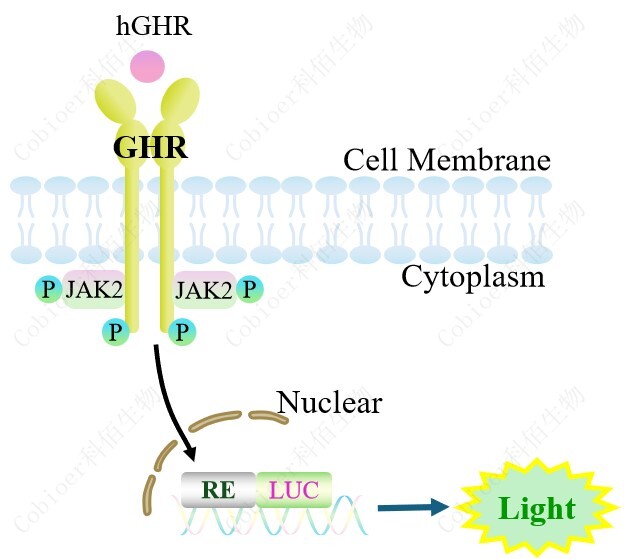 GHR Effector Reporter Cell 報告基因藥靶模型很好的模擬了體內(nèi) GHR 的信號轉(zhuǎn)導過程, 原理見下圖所示。![]() Figure 1. : GHR Effector Reporter Cell 細胞模型原理圖 |