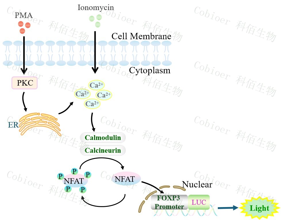 FOXP3 promoter-Luc Jurkat 報告基因細(xì)胞,是由 FOXP3 調(diào)控并表達 Luc 熒光素酶報告基因的 Jurkat 細(xì)胞。PMA 是 DAG(二酯酰甘油)的類似物,可自由的通過 細(xì)胞膜,可用于測定 CD3/CD28 介導(dǎo)的 T 細(xì)胞活化,原理見下圖所示。 Figure 1. FOXP3 promoter-Luc Jurkat 細(xì)胞模型原理圖 |