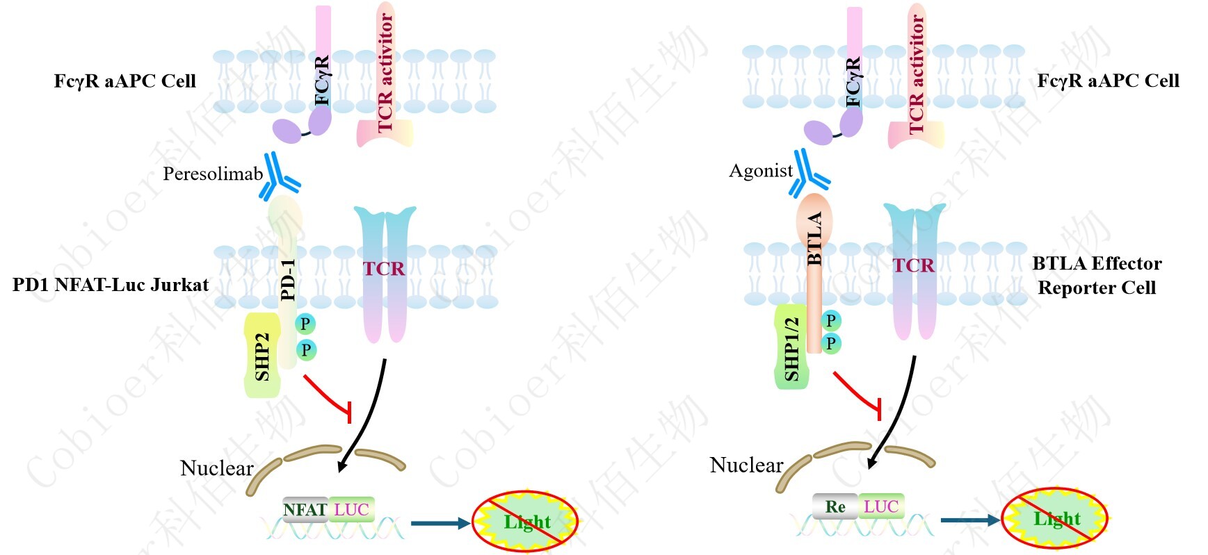 FcγR aAPC Cell在基礎(chǔ)細(xì)胞上穩(wěn)定表達(dá) FcγR 和 aAPC。FcγR aAPC Cell 作為 PD1 NFAT-Luc Jurkat Cell/BTLA Effector Reporter Cell 的靶細(xì)胞進(jìn)行功能檢測(cè)的原 理圖見(jiàn)下圖所示。![]() Figure 1. FcγR aAPC Cell 的原理圖 |