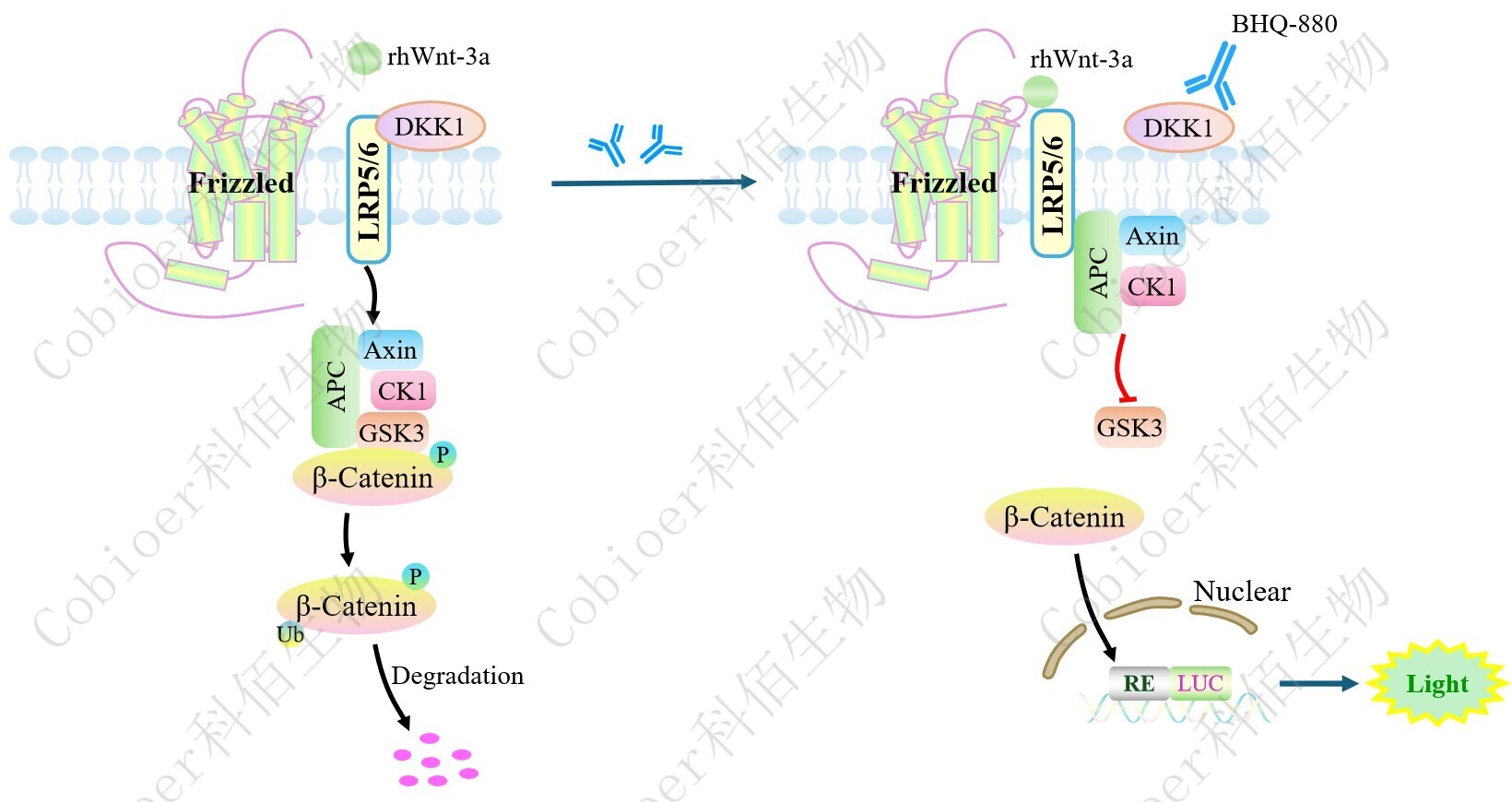 Wnt 信號(hào)通路是一種進(jìn)化保守的通路,控制發(fā)育的多個(gè)方面,包括成人發(fā)育過(guò)程中的 細(xì)胞增殖、細(xì)胞凋亡、細(xì)胞遷移和細(xì)胞極性以及干細(xì)胞維持。 低密度脂蛋白(LDL)受體相關(guān)蛋白 5/6(LRP5/6)是單層跨膜糖蛋白,是典型 Wnt 信號(hào) 通路的重要共受體。LRP5/6 有由四個(gè)重復(fù)單元(E1,E2,E3 和 E4)組成的細(xì)胞外結(jié)構(gòu)域 (ECD),且 ECD 是 Wnt 信號(hào)傳導(dǎo)的重要調(diào)控位點(diǎn),為 Wnt 配體提供了至少兩個(gè)獨(dú)立的結(jié)合 位點(diǎn)。典型 Wnt 信號(hào)通路的激活發(fā)生在 Wnt 配體與其共受體 LRP5/6 結(jié)合,然后與卷曲受 體(FZD)形成復(fù)合物。Wnt-FZD-LRP5/6 復(fù)合體的形成,Axin 介導(dǎo)的破壞復(fù)合體就會(huì)通過(guò)被 破壞復(fù)合體內(nèi)的其他蛋白質(zhì)磷酸化而轉(zhuǎn)運(yùn)到質(zhì)膜上,從而抑制 b-catenin 的磷酸化。該破壞 復(fù)合體由 Axin、APC、CK1 和 GSK3 組成。 作為一種分泌糖蛋白,DKK1 通過(guò) Wnt 蛋白與 LRP5/6 受體競(jìng)爭(zhēng)性結(jié)合,作為 Wnt/β- catenin 信號(hào)通路的拮抗劑。這種調(diào)控影響細(xì)胞增殖、分化、癌變、凋亡、腫瘤細(xì)胞侵襲和 遷移。 |