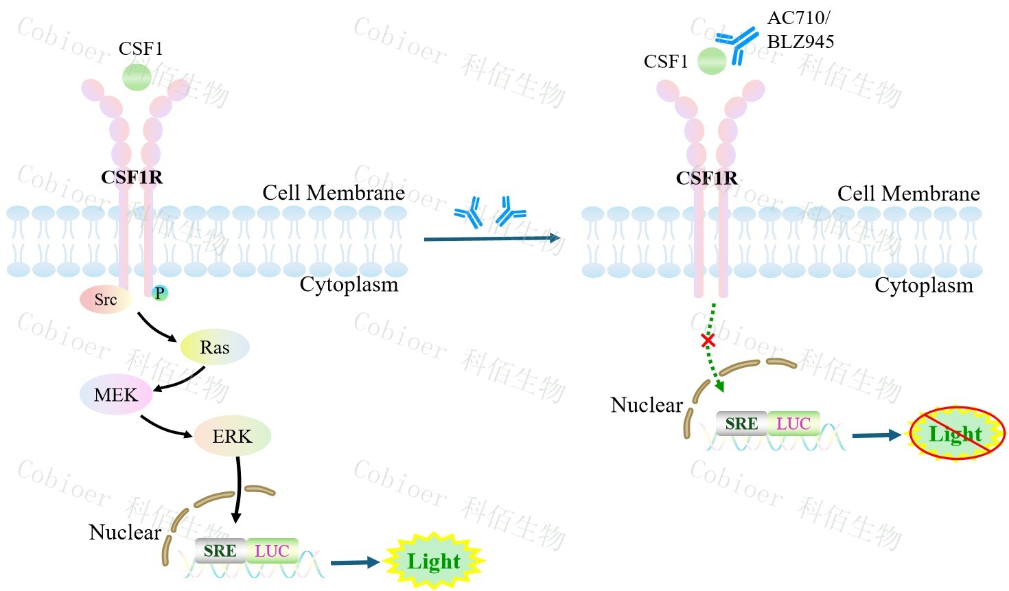 CSF1R SRE-Luc HEK293 報(bào)告基因藥靶模型很好的模擬了體內(nèi) CSF1 的信號(hào)轉(zhuǎn)導(dǎo)過程, 原理見下圖所示。 Figure 1. CSF1R SRE-Luc HEK293 細(xì)胞模型原理圖