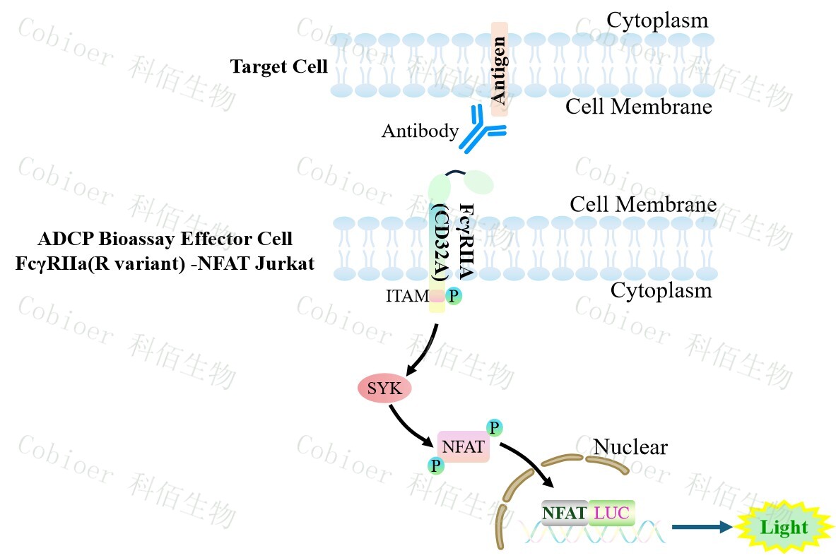 Figure 1. ADCP Bioassay Effector Cell FcγRIIa(R variant) -NFAT Jurkat 細胞模型原理圖