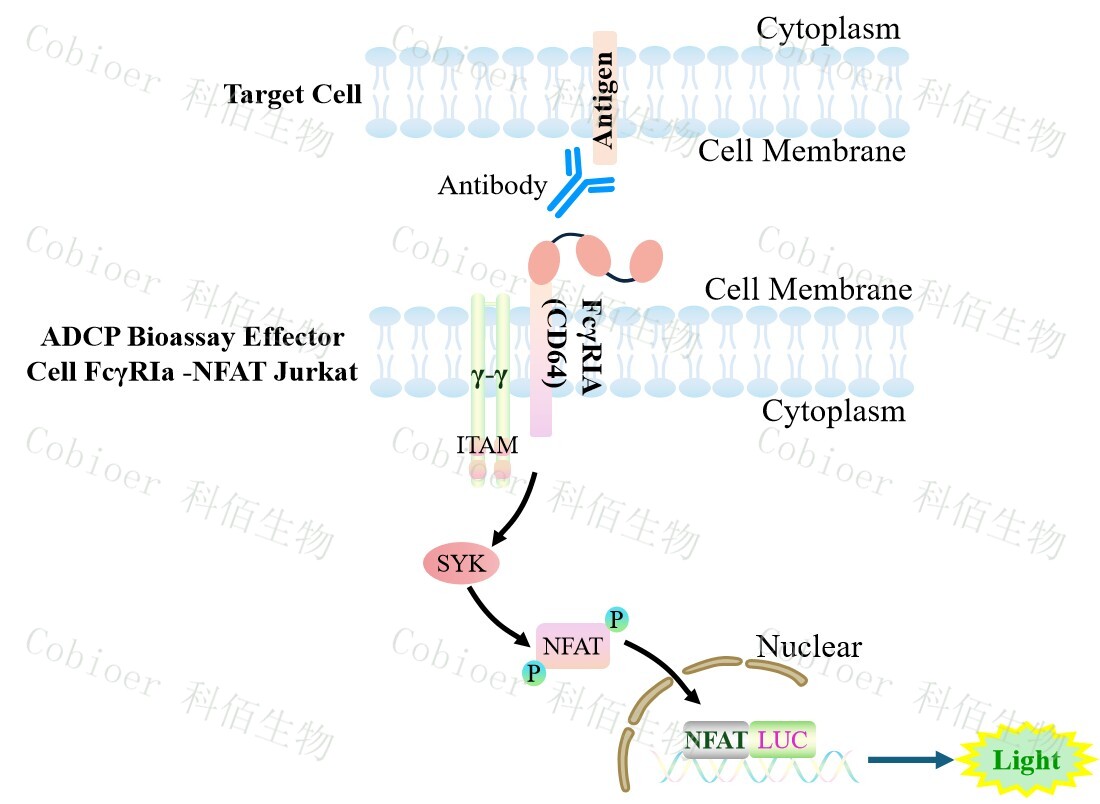 ADCP Bioassay Effector Cell FcγRIa -NFAT Jurkat 報告基因藥靶模型很好的模擬了體內(nèi) ADCP 的信號轉(zhuǎn)導(dǎo)過程,原理見下圖所示。