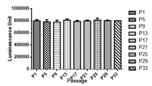 Figure. Stablity test results. Glioma261-Luc cells showed at least 32 passage stability with similar luminescence unit. |