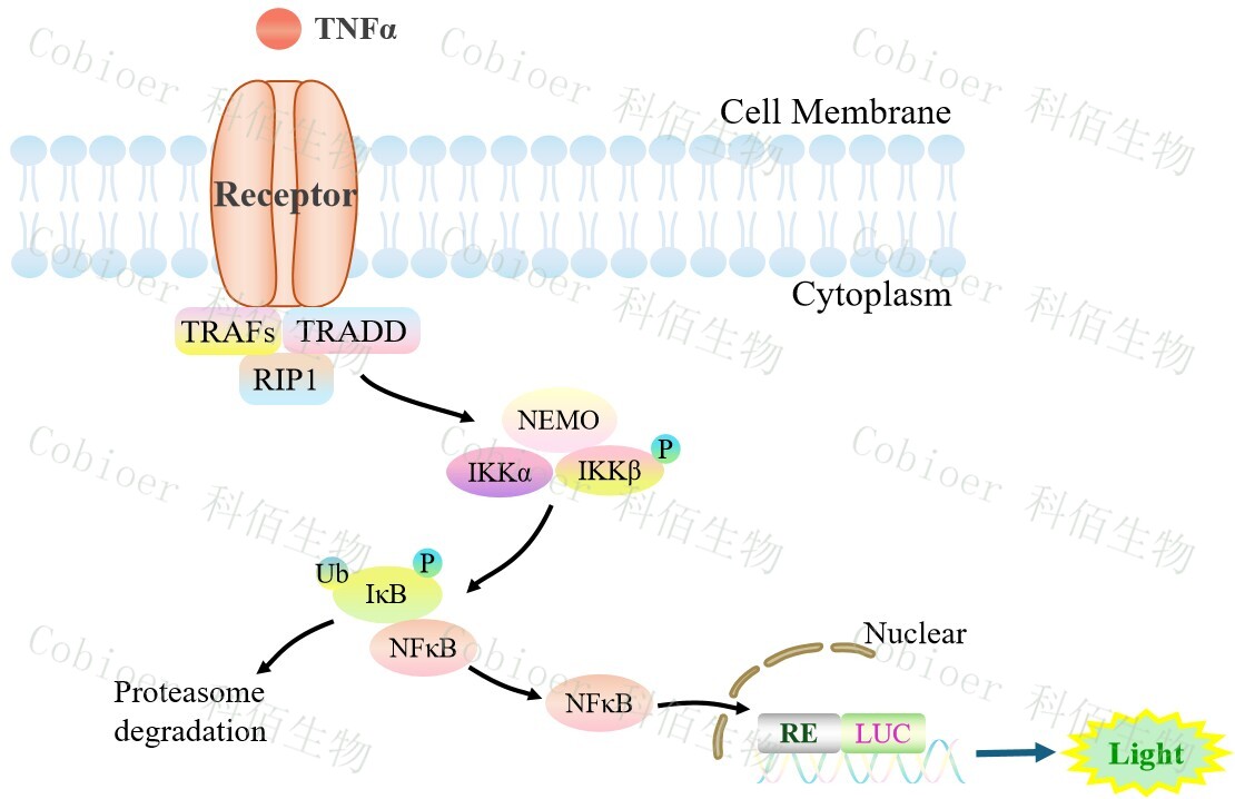 NFκB-Luc THP-1 報告基因細胞是由 NFκB 調(diào)控并表達 Luc 熒光素酶報 告基因的 THP-1 細胞。TNFα 與受體結(jié)合,激活 NF-κB 的原理見下圖所示。![]() Figure 1. NFκB-Luc THP-1 細胞模型原理圖