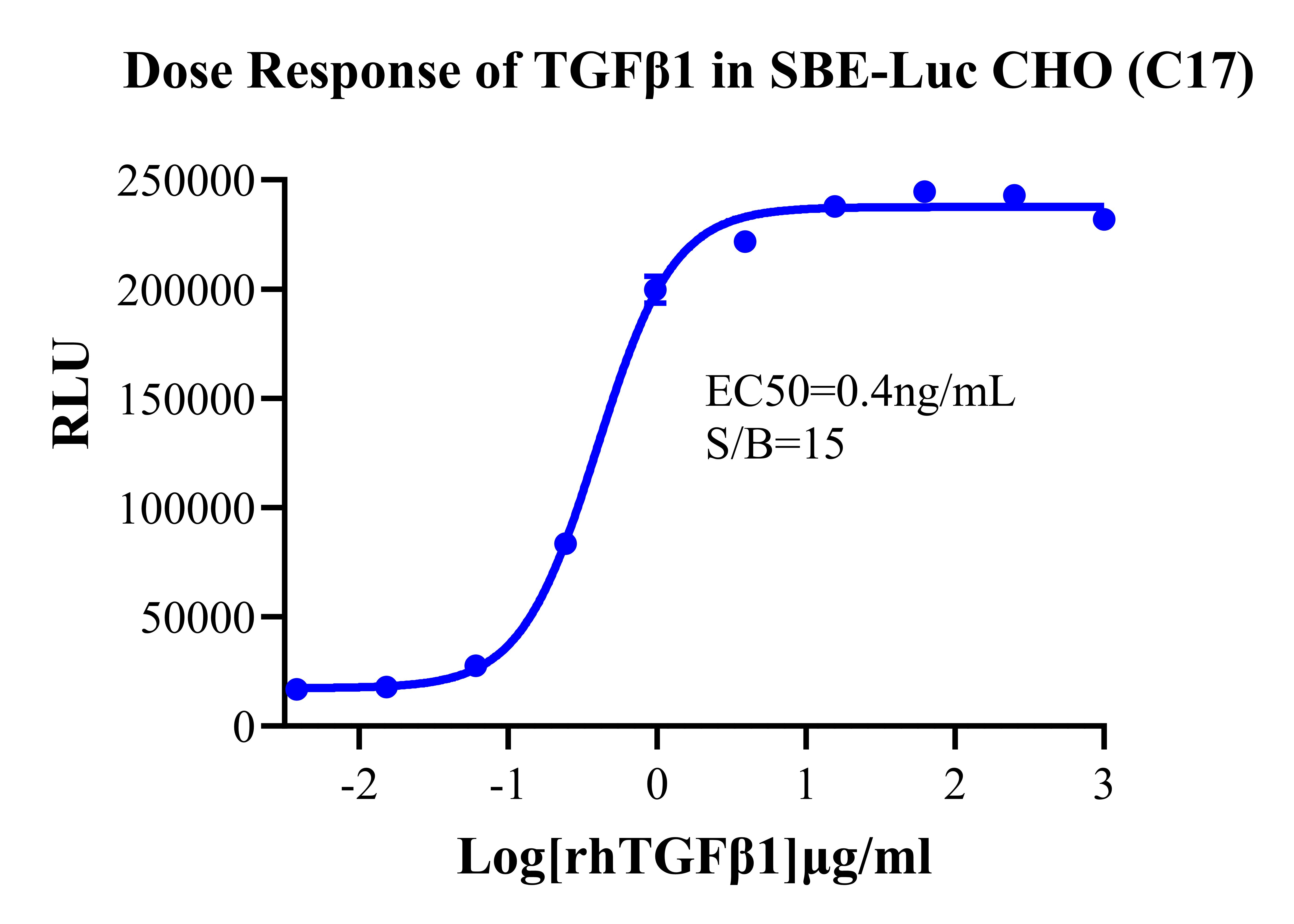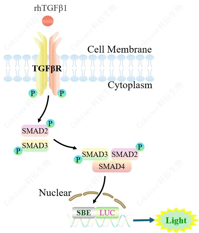 SBE-Luc CHO 報(bào)告基因細(xì)胞,是由 SBE 調(diào)控并表達(dá) Luc 熒光素酶報(bào)告 基因的 CHO 細(xì)胞。TGF-β與受體結(jié)合,激活 SBE 的原理見(jiàn)下圖所示。
