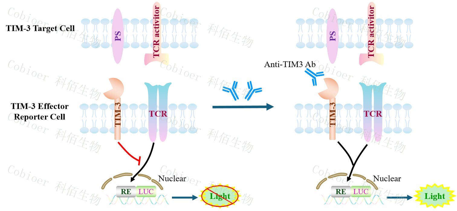 TIM-3 Target Cell 作為 TIM-3 Effector Reporter Cell 的靶細(xì)胞,報(bào)告基因藥靶模型很好的模擬了體內(nèi) TIM-3 的信號(hào)轉(zhuǎn)導(dǎo)過程,原理見下圖所示。![]() Figure 1. TIM-3 Target Cell 細(xì)胞模型原理圖 |