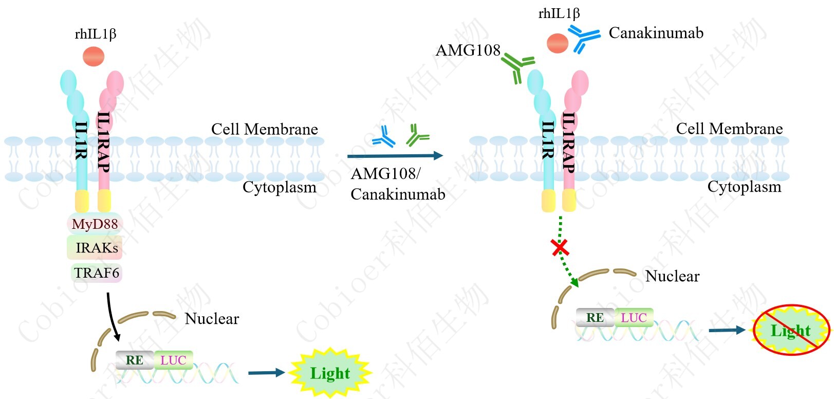 IL1 Effector Reporter Cell 報告基因藥靶模型很好的模擬了體內(nèi) IL1 的信號轉(zhuǎn)導(dǎo)過程, 原理見下圖所示。