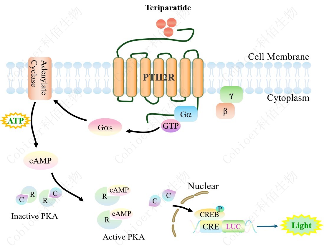 PTH2R CRE-Luc HEK293 報(bào)告基因藥靶模型很好的模擬了體內(nèi) PTH2R 的信號(hào)轉(zhuǎn)導(dǎo)過(guò) 程,原理見(jiàn)下圖所示。 ![]() Figure 1. PTH2R CRE-Luc HEK293 細(xì)胞模型原理圖 |