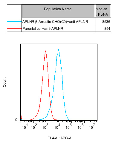 APLNR(APJ) β-Arrestin CHO 報(bào)告基因藥靶模型很好的模擬了體內(nèi) APLNR(APJ) /β-Arrestin 的信號(hào)轉(zhuǎn)導(dǎo)過(guò)程,原理見(jiàn)下圖所示。當(dāng)缺乏配體刺激時(shí),β-Arrestin 不與 APLNR (APJ)結(jié)合,融合β-Arrestin 的熒光素酶處于失活構(gòu)象,當(dāng) APLNR(APJ)遭遇配體刺激 時(shí),融合熒光素酶報(bào)告基因的β-Arrestin 被招募,使熒光素酶報(bào)告基因處于激活狀態(tài),加入 其底物后發(fā)光信號(hào)增強(qiáng)。![]() Figure 1. APLNR(APJ) β-Arrestin CHO 細(xì)胞模型原理圖 |