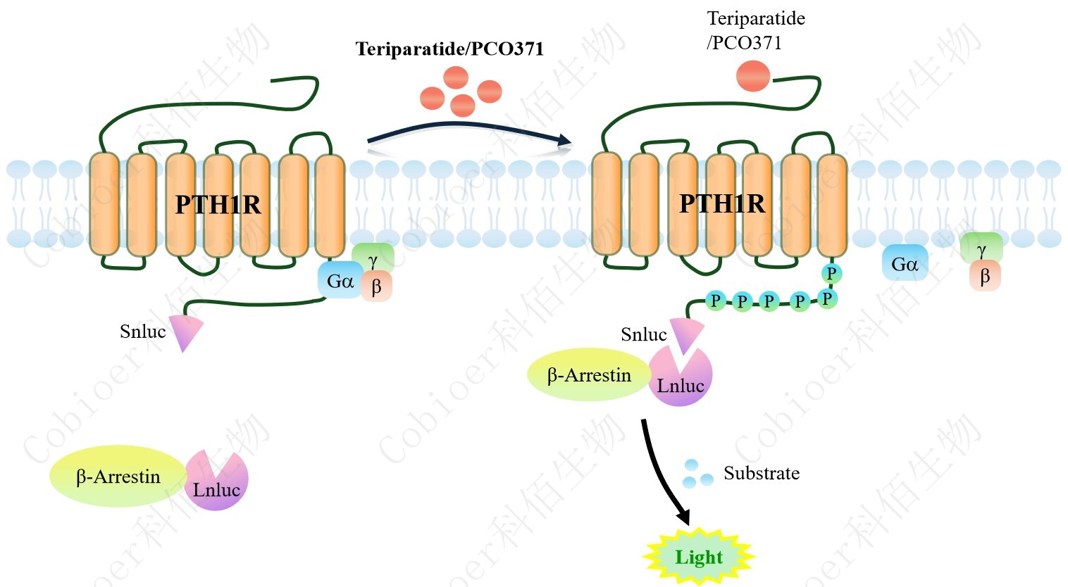 PTH1R β-Arrestin CHO PTH1R β-Arrestin CHO 報(bào)告基因藥靶模型很好的模擬了體內(nèi) PTH1R/β-Arrestin 的信號(hào) 轉(zhuǎn)導(dǎo)過(guò)程,原理見(jiàn)下圖所示。當(dāng)缺乏配體刺激時(shí),β-Arrestin 不與 PTH1R 結(jié)合,融合β- Arrestin 的熒光素酶處于失活構(gòu)象,當(dāng) PTH1R 遭遇配體刺激時(shí),融合熒光素酶報(bào)告基因的 β-Arrestin 被招募,使熒光素酶報(bào)告基因處于激活狀態(tài),加入其底物后發(fā)光信號(hào)增強(qiáng)。 ![]() Figure 1. PTH1R β-Arrestin CHO 細(xì)胞模型原理圖 |