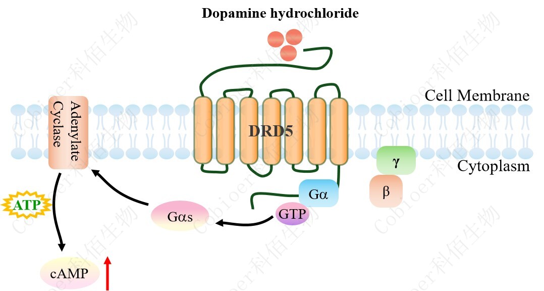 cAMP 在 G 蛋白偶聯(lián)受體(GPCR)信號(hào)轉(zhuǎn)導(dǎo)中是一種關(guān)鍵的第二信使。當(dāng)配體結(jié)合 到 GPCR,構(gòu)象發(fā)生變化,激活受體接著激活 G 蛋白,Gs 的激活導(dǎo)致腺苷酸環(huán)化酶調(diào)控 cAMP 的升高。DRD5 CHO 藥靶模型很好的模擬了體內(nèi) DRD5 的信號(hào)轉(zhuǎn)導(dǎo)過(guò)程,原理見(jiàn)下圖所 示。