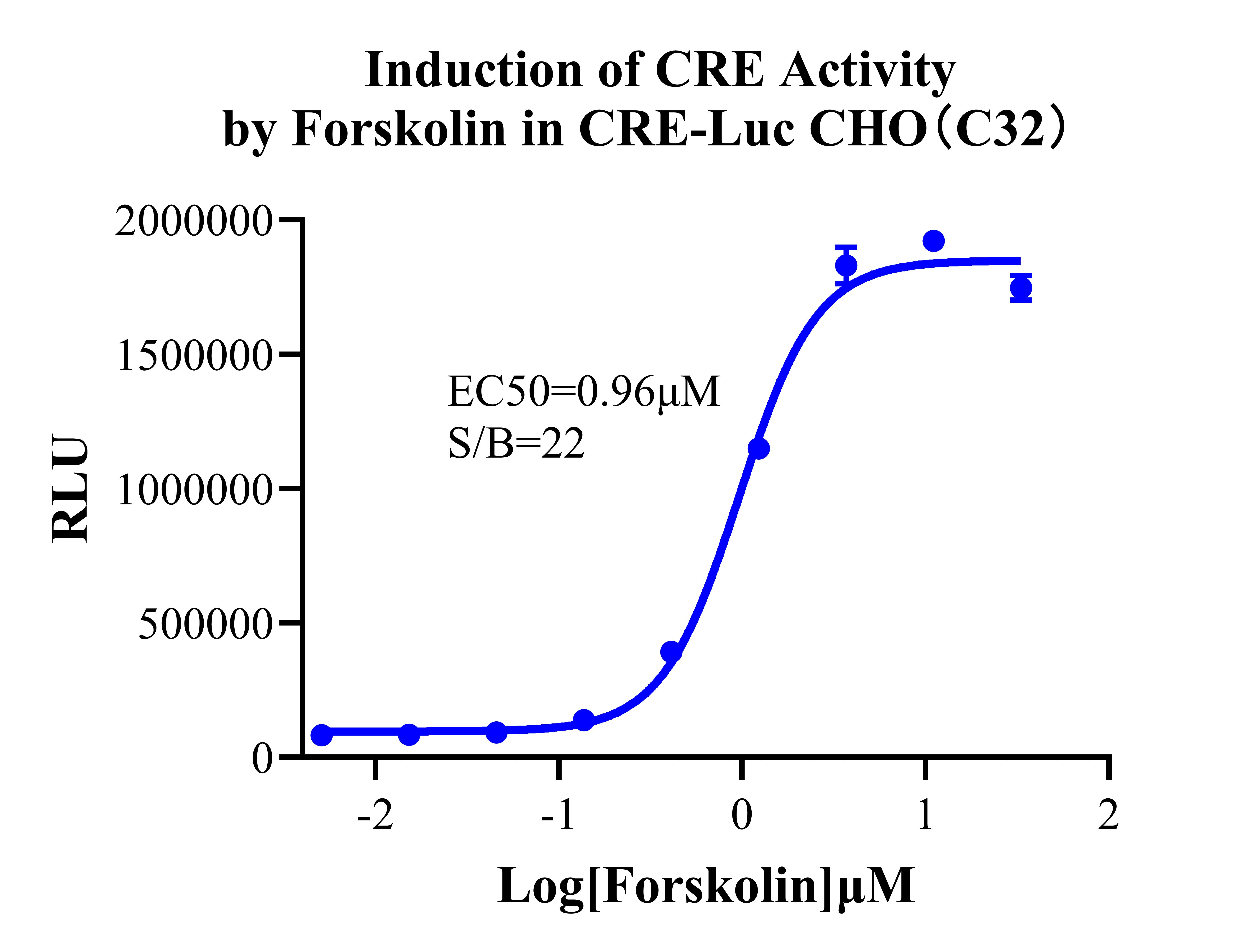 CRE-Luc CHO 報告基因細胞,是由 CRE 調控并表達 Luc 熒光素酶報告 基因的 CHO 細胞。Forskolin 是天然存在的直接腺苷酸環(huán)化酶(AC)/cAMP/CREB 的激活 劑,原理見下圖所示。