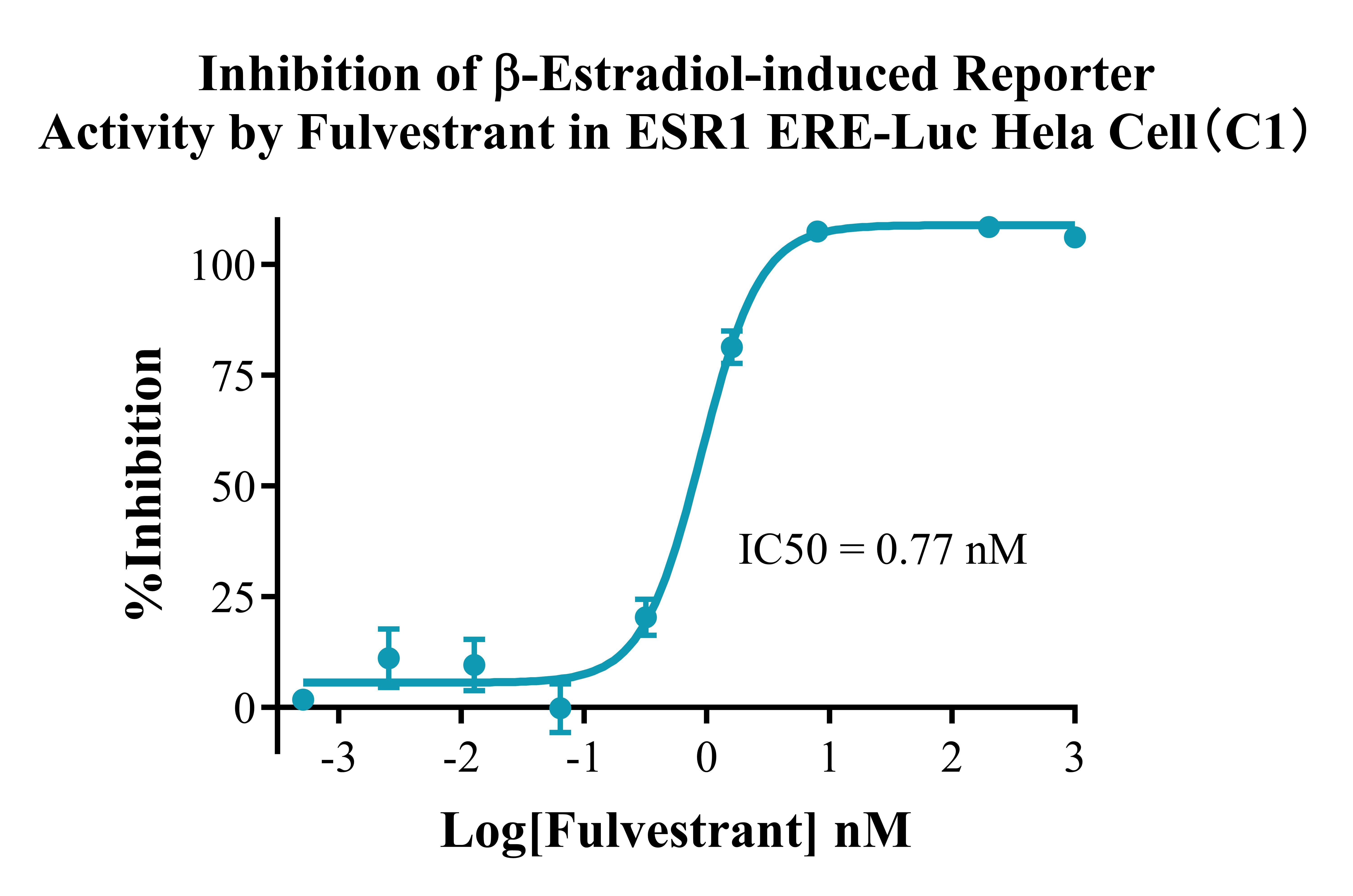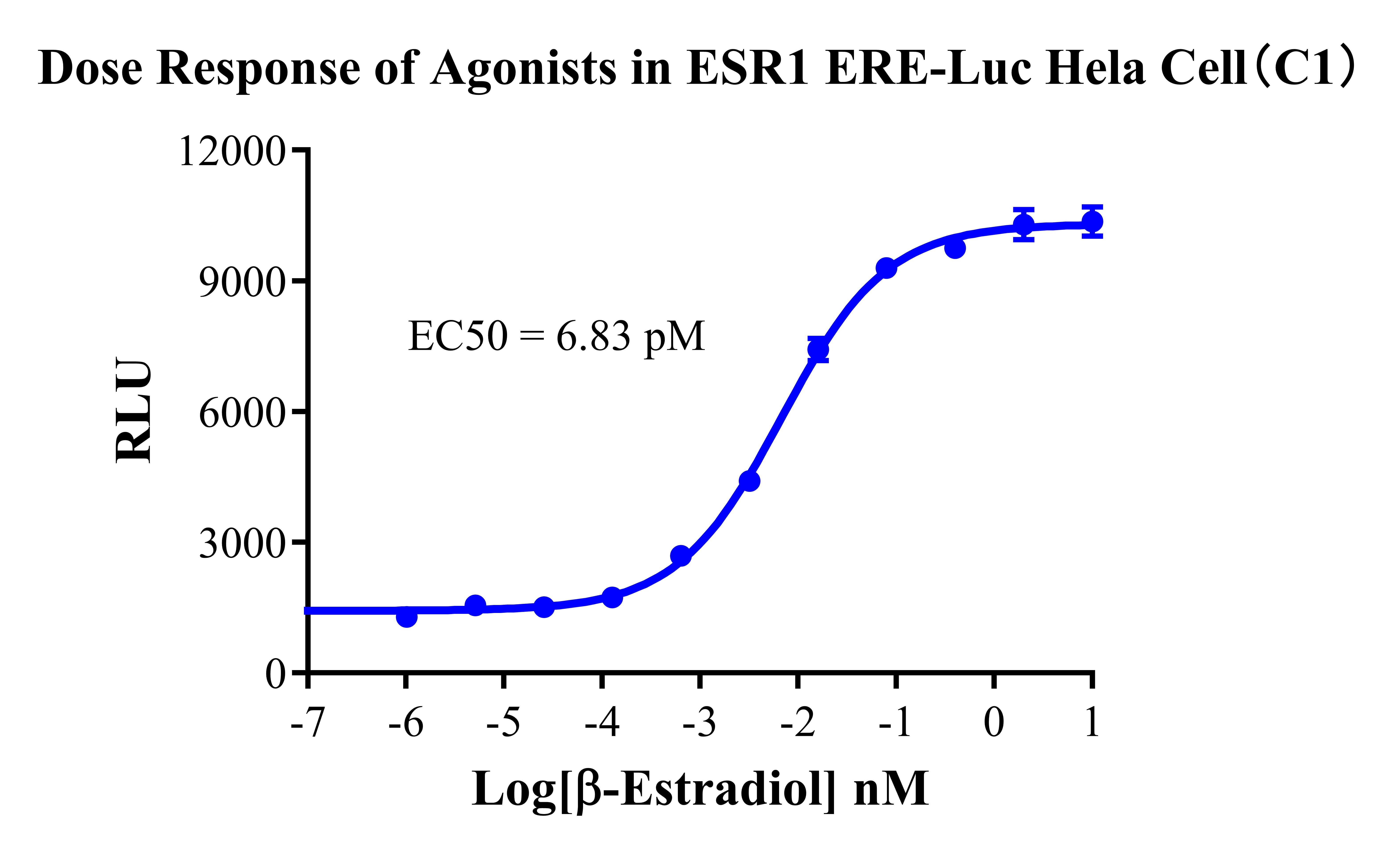 ESR1 ERE-Luc Hela Cell,是由 ERE 調(diào)控并表達(dá) Luc 熒光素酶報(bào)告基因 的 Hela 細(xì)胞。β-雌二醇(17β-Estradiol,E2)是人體內(nèi)活性最強(qiáng)的雌激素,主要通過結(jié)合 ER 發(fā)揮作用,調(diào)控基因表達(dá)和細(xì)胞功能,原理見下圖所示。![]() Figure 1. ESR1 ERE-Luc Hela Cell 原理示意圖 |