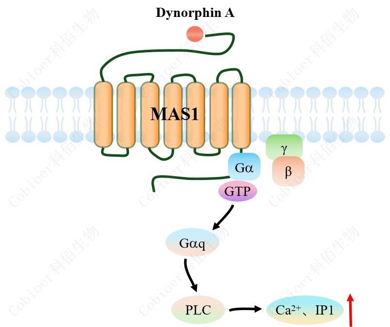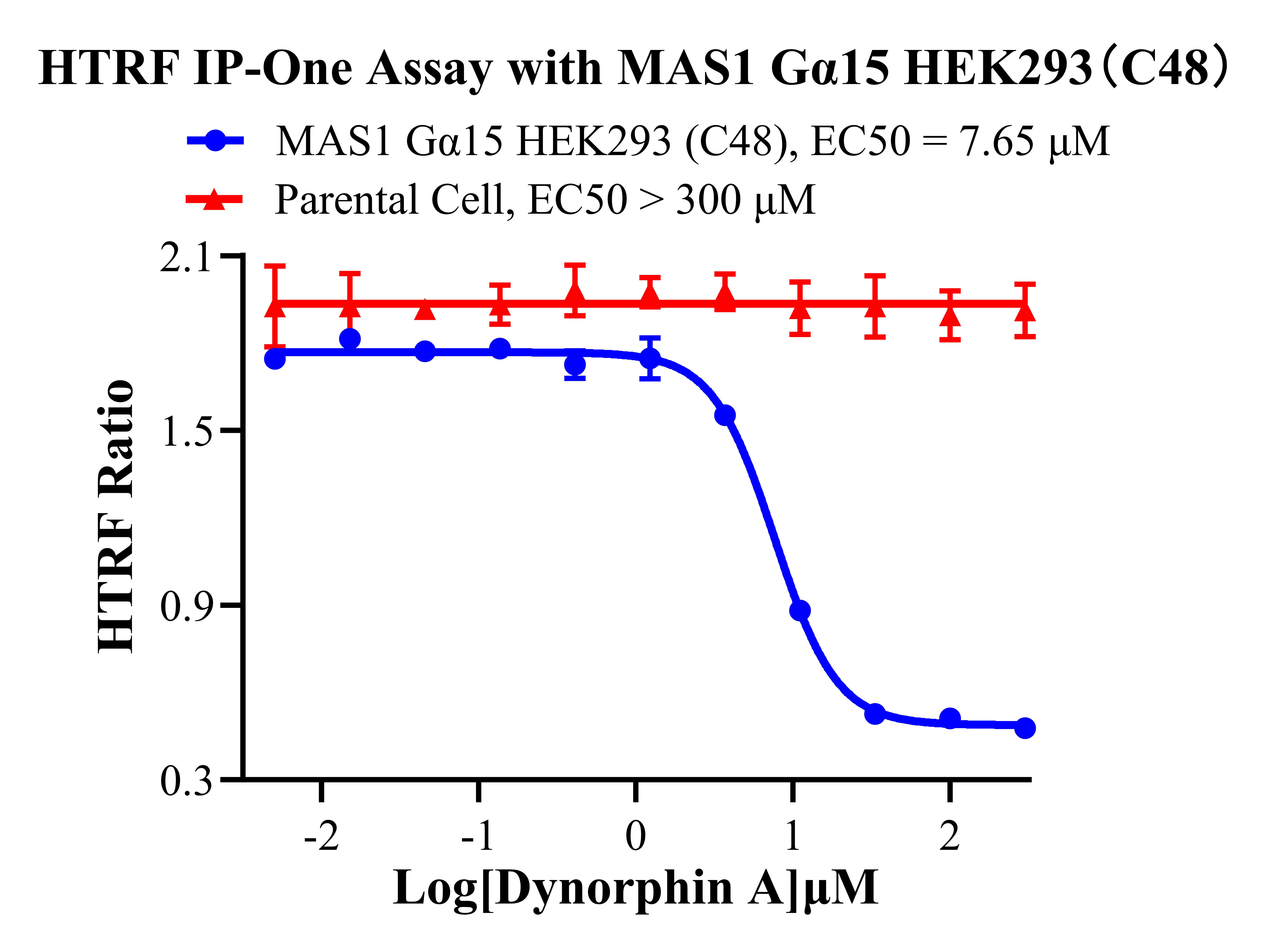 MAS1 可以通過(guò) Gq 蛋白的信號(hào)通路,調(diào)控 IP1 的升高。MAS1 與配體結(jié)合,導(dǎo)致 Gαq 亞基的激活,觸發(fā) PLC-γ,從而產(chǎn)生兩個(gè)第二信使:IP3 和 DAG,它們參與細(xì)胞內(nèi)鈣動(dòng)員。 由于 IP3 在代謝上不穩(wěn)定,因此測(cè)量通路激活的替代標(biāo)志物 IP1 作為檢測(cè)標(biāo)準(zhǔn)。
