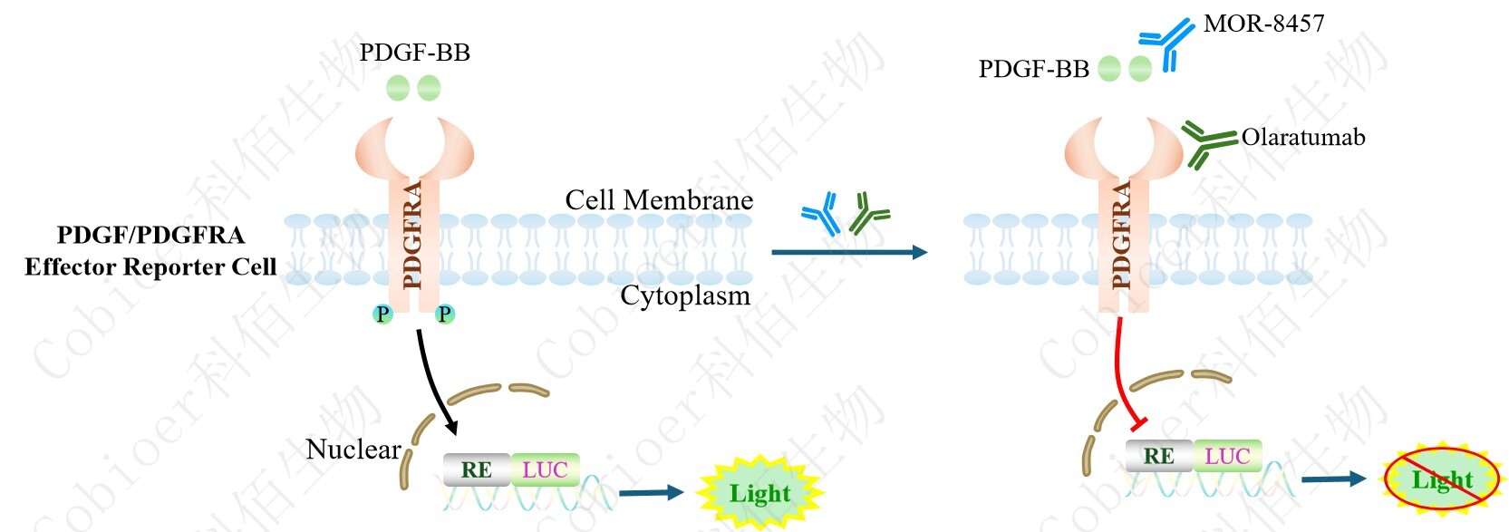 PDGF/PDGFRA Effector Reporter Cell 報(bào)告基因藥靶模型很好的模擬了體內(nèi) PDGFRA 的信號(hào)轉(zhuǎn)導(dǎo)過(guò)程,原理見(jiàn)下圖所示。