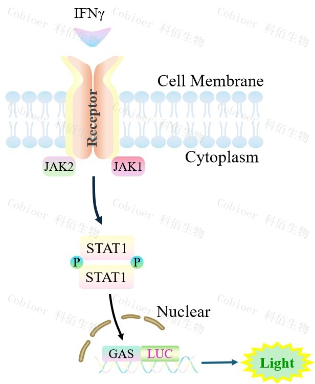GAS-Luc HEK293 報(bào)告基因細(xì)胞,是由 GAS 調(diào)控并表達(dá) Luc 熒光素酶 報(bào)告基因的 HEK293 細(xì)胞。IFNγ與受體結(jié)合,激活 GAS 的原理見(jiàn)下圖所示。