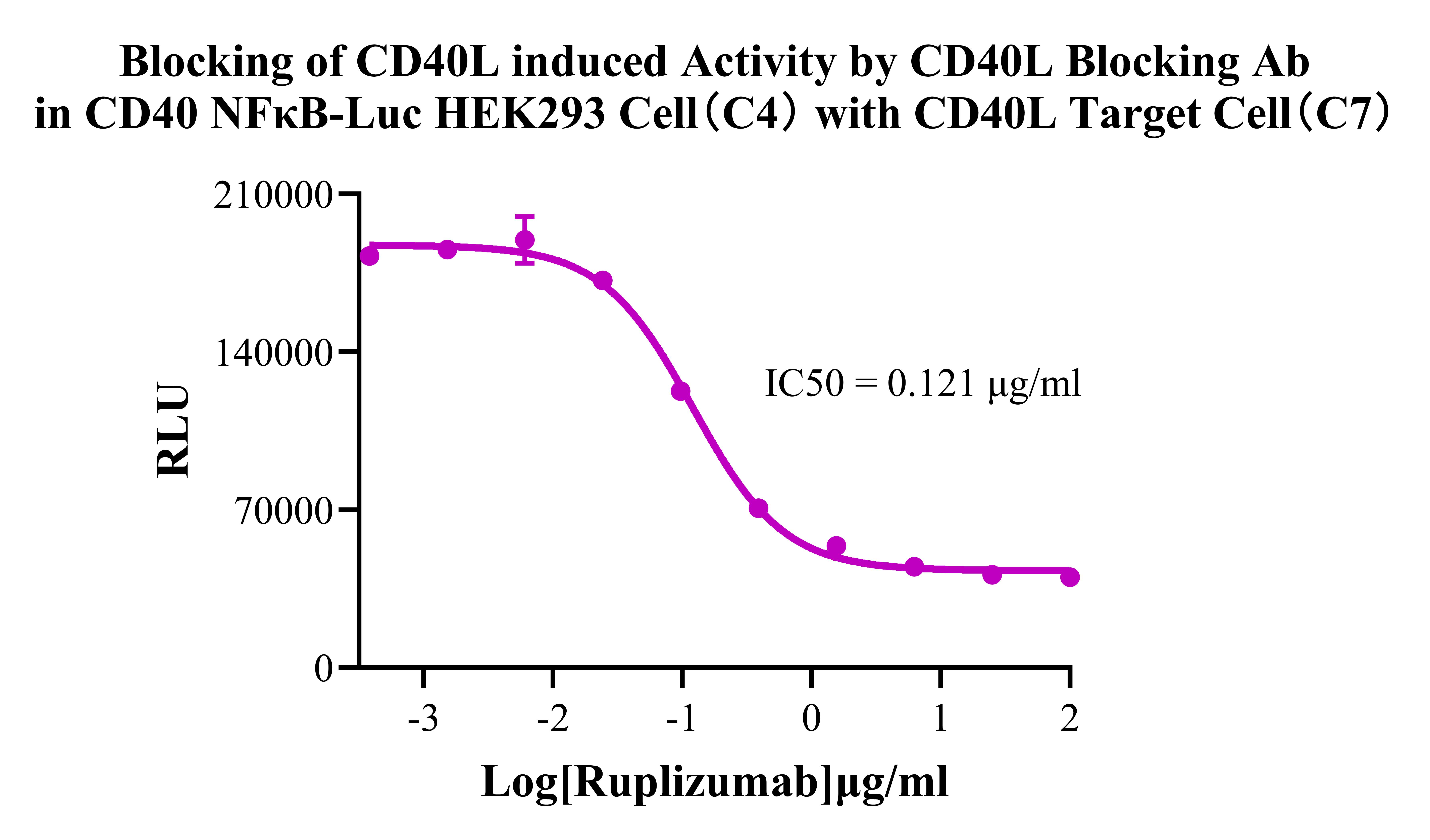 IV. Representative Data![]() Figure 1. Recombinant CD40L Target Cell stably expressing CD40L. ![]() Figure 2. Blocking of CD40L induced Activity by CD40L Blocking Ab in CD40 NFκB-Luc HEK293 Cell(C4) with CD40L Target Cell(C7). |