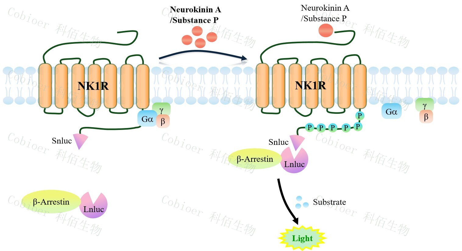 NK1R β-Arrestin CHO 報告基因藥靶模型很好的模擬了體內(nèi) NK1R/β-Arrestin 的信號轉(zhuǎn) 導(dǎo)過程,原理見下圖所示。當(dāng)缺乏配體刺激時,β-Arrestin 不與 NK1R 結(jié)合,融合β-Arrestin的熒光素酶處于失活構(gòu)象,當(dāng) NK1R 遭遇配體刺激時,融合熒光素酶報告基因的β-Arrestin 被招募,使熒光素酶報告基因處于激活狀態(tài),加入其底物后發(fā)光信號增強(qiáng)。![]() Figure 1. NK1R β-Arrestin CHO 細(xì)胞模型原理圖 |