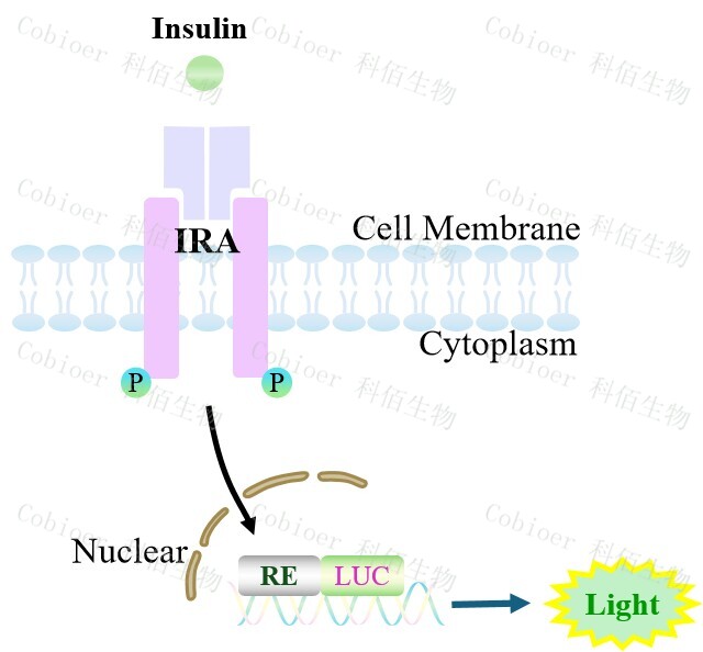 IRA Effector Reporter Cell 報(bào)告基因藥靶模型很好的模擬了體內(nèi) Insulin 的信號(hào)轉(zhuǎn)導(dǎo)過(guò)程, 原理見(jiàn)下圖所示。![]() Figure 1. IRA Effector Reporter Cell 細(xì)胞模型原理圖 |