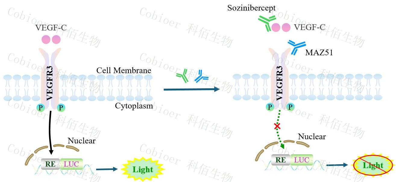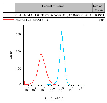 VEGFC/VEGFR3 Effector Reporter Cell 報告基因藥靶模型很好的模擬了體內(nèi) VEGFC/VEGFR3 的信號轉(zhuǎn)導(dǎo)過程,原理見下圖所示。![]() Figure 1. VEGFC/VEGFR3 Effector Reporter Cell 細(xì)胞模型原理圖 |