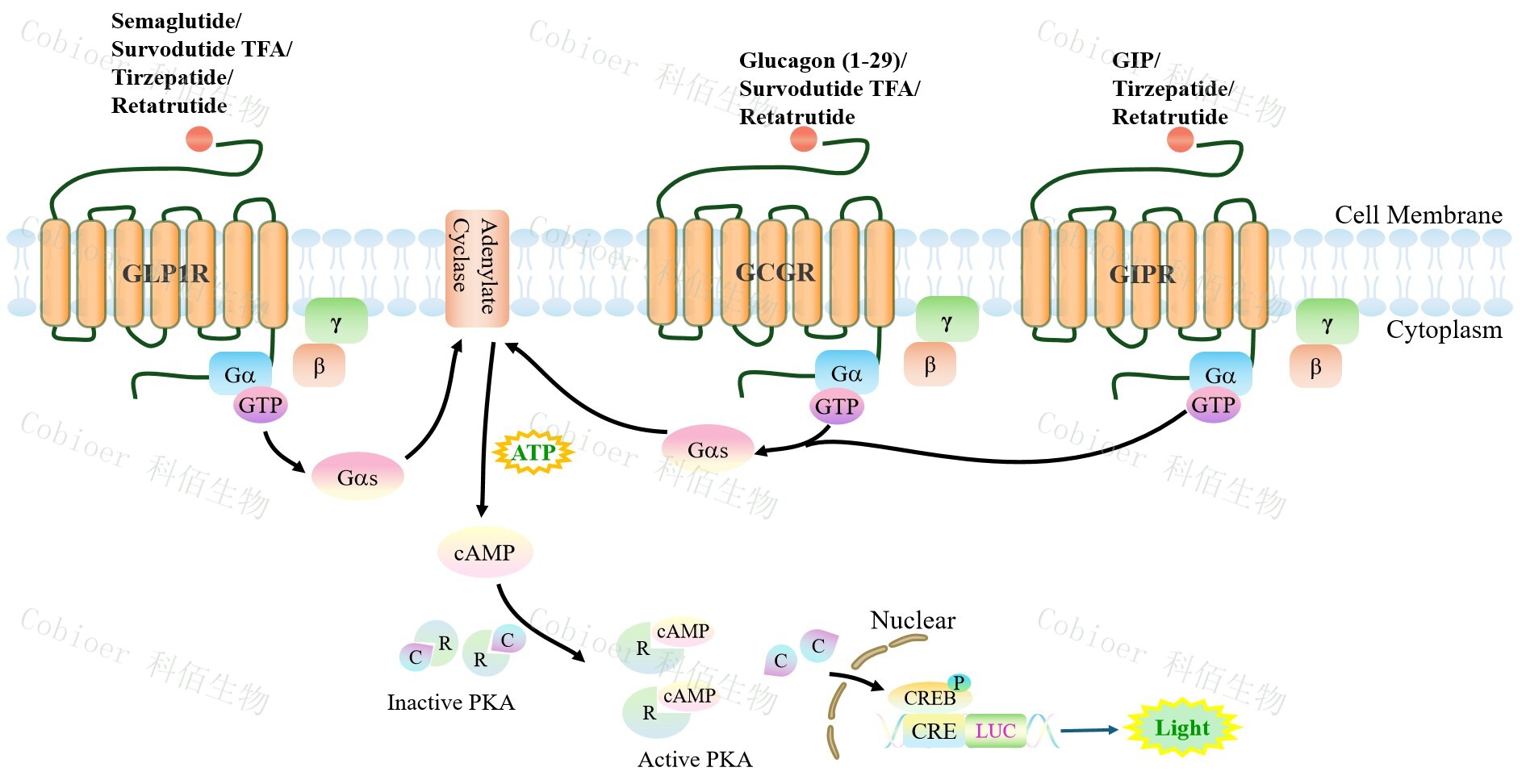 GLP1R&GCGR&GIPR Triple Reporter Cell 報告基因藥靶模型很好的模擬了體內(nèi)GLP1R&GCGR&GIPR 的信號轉(zhuǎn)導(dǎo)過程,原理見圖1 所 Figure 1. GLP1R&GCGR&GIPR Triple Reporter Cell 細(xì)胞模型原理圖