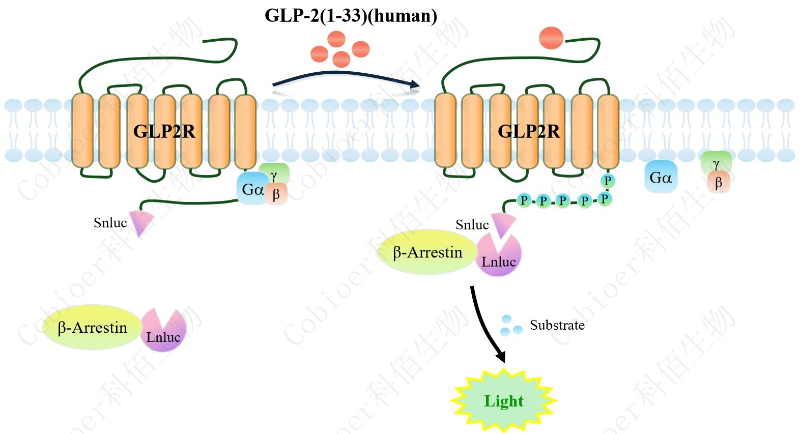 GLP2R β-Arrestin CHO 報(bào)告基因藥靶模型很好的模擬了體內(nèi) GLP2R/β-Arrestin 的信號(hào)轉(zhuǎn)導(dǎo)過程,原理見下圖所示。當(dāng)缺乏配體刺激時(shí),β-Arrestin 不與 GLP2R 結(jié)合,融合β- Arrestin 的熒光素酶處于失活構(gòu)象,當(dāng) GLP2R 遭遇配體刺激時(shí),融合熒光素酶報(bào)告基因的 β-Arrestin 被招募,使熒光素酶報(bào)告基因處于激活狀態(tài),加入其底物后發(fā)光信號(hào)增強(qiáng)。
