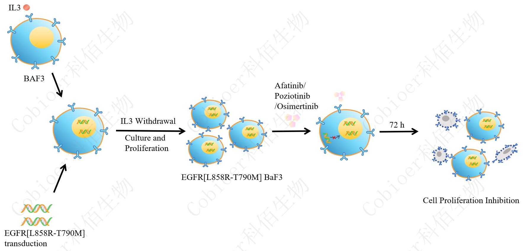 BaF3(小鼠原 B 細(xì)胞)的生長(zhǎng)和增殖需要 IL-3 的維持。通過(guò)引入各種表達(dá)激酶的基因, 能作為 BaF3 的驅(qū)動(dòng)基因,讓 BaF3 不再依賴 IL-3 而增殖,進(jìn)而激酶基因成為 BaF3 增殖依 賴的驅(qū)動(dòng)基因,用于評(píng)估小分子藥物對(duì)激酶的靶向抑制作用,原理及流程見(jiàn)下圖所示。