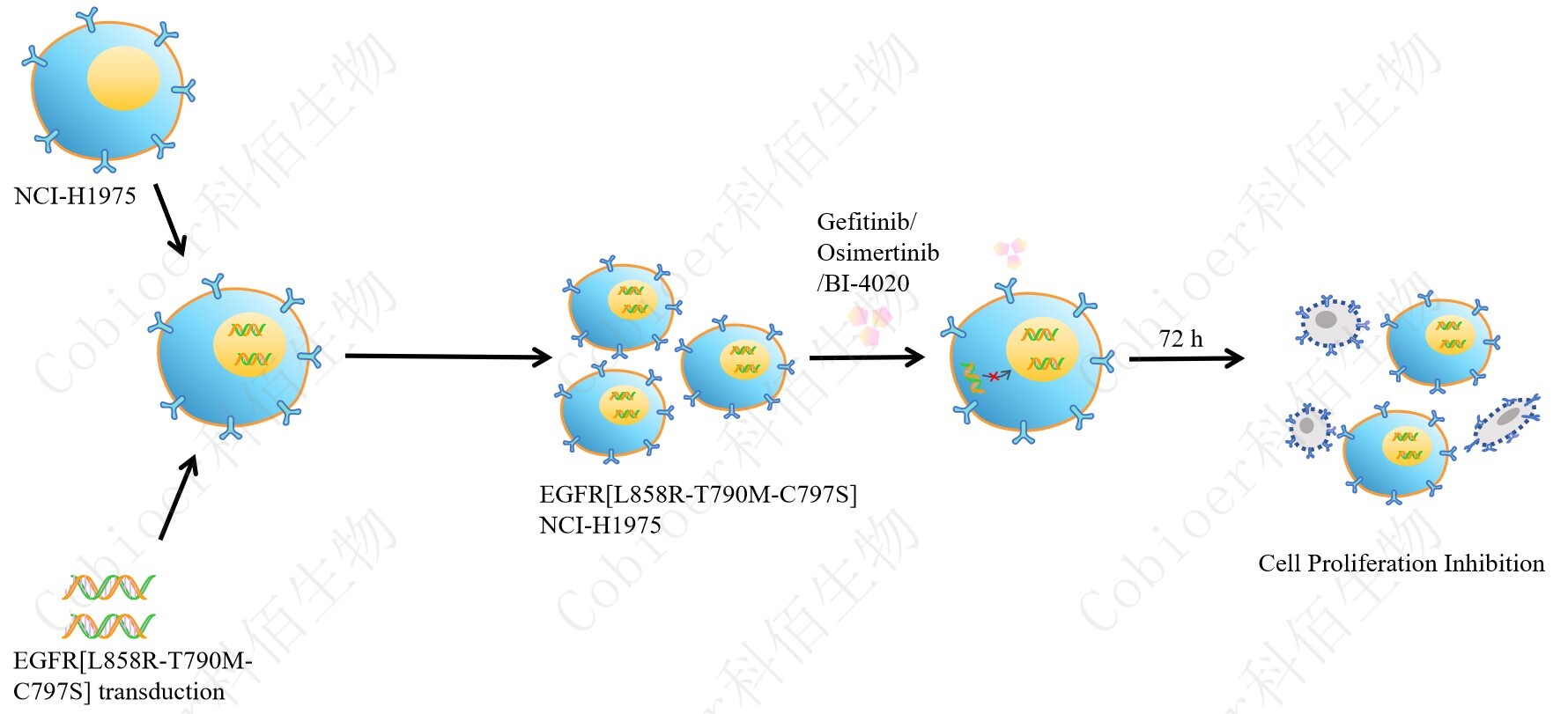 EGFR[L858R-T790M-C797S] NCI-H1975 藥靶細胞,通過轉導突變狀態(tài) 的 EGFR[L858R-T790M-C797S]基因到 NCI-H1975 細胞系中,穩(wěn)定表達人突變形態(tài)下的 EGFR[L858R-T790M-C797S]基因,原理及流程見下圖所示。![]() Figure 1. EGFR[L858R-T790M-C797S] NCI-H1975 細胞的構建原理圖 |