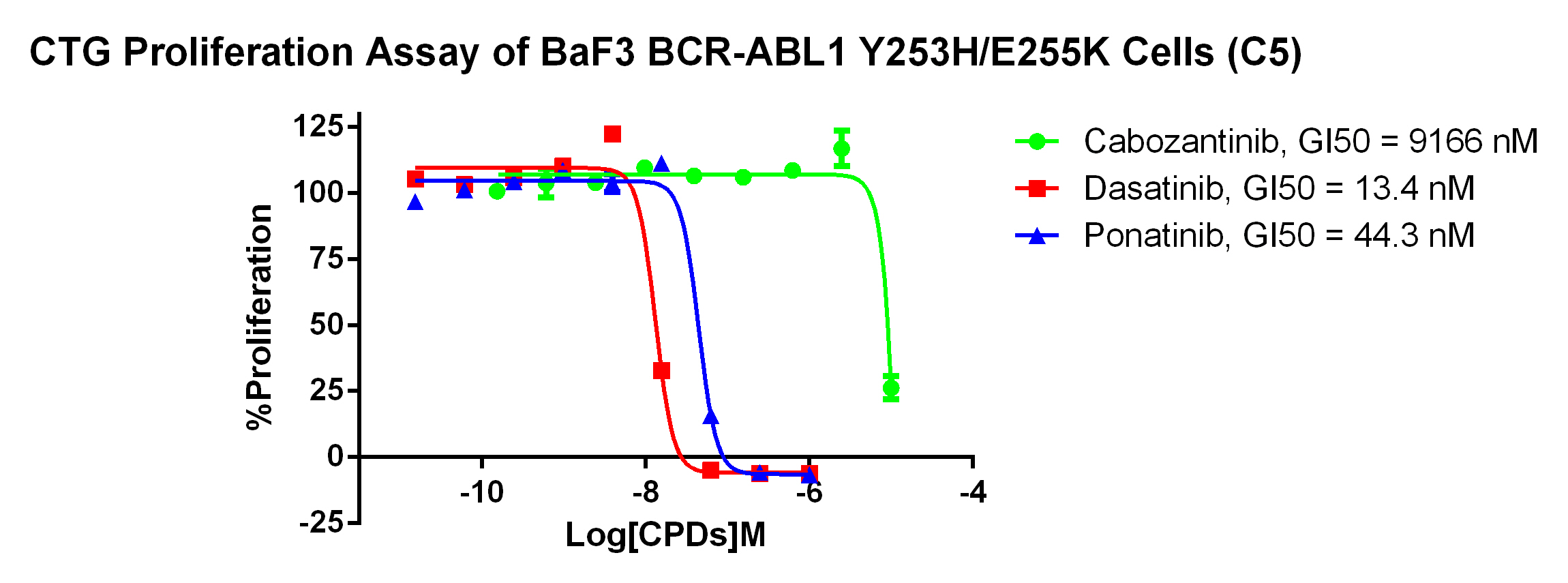 3. Anti-proliferation assay Figure 3. CTG Proliferation Assay of BaF3 BCR-ABL1 Y253H/E255K Cells (C5). |