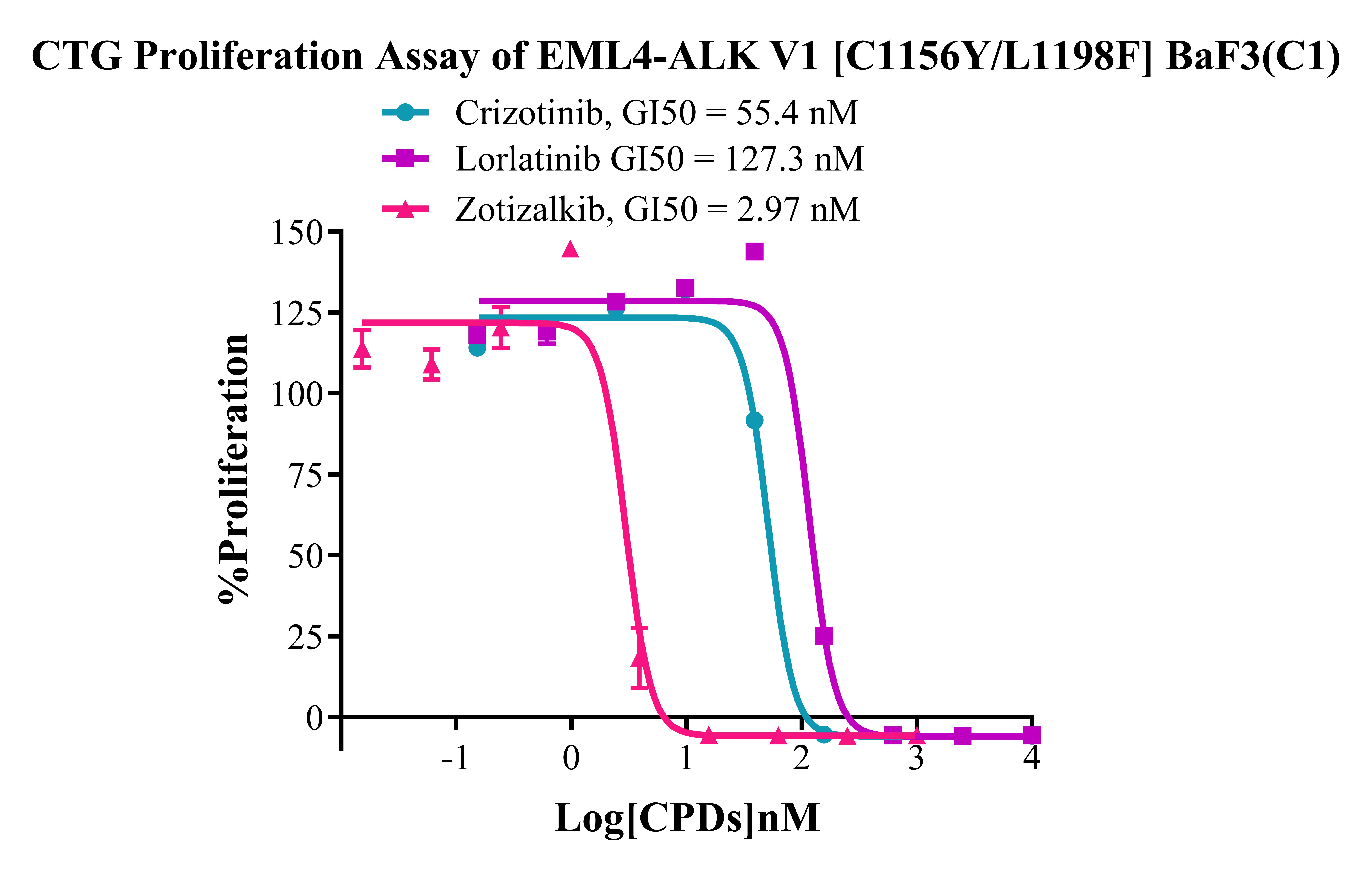 2. Anti-proliferation assay Figure 5. CTG Proliferation Assay of EML4-ALK V1 [C1156Y/L1198F] BaF3(C1). |