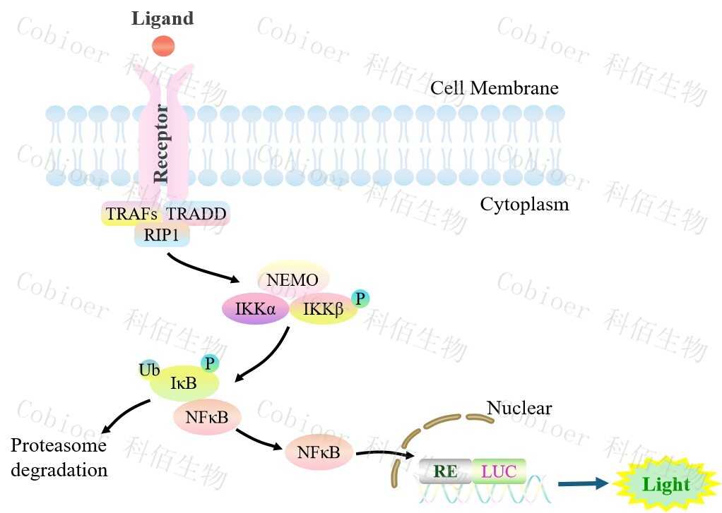 NFκB-Luc HEK293 報(bào)告基因細(xì)胞,是由 NFκB 調(diào)控并表達(dá) Luc 熒光素酶 報(bào)告基因的 HEK293 細(xì)胞。配體與受體結(jié)合后,激活 NF-κB 的原理見(jiàn)下圖所示。![]() Figure 1:NFκB-Luc HEK293 細(xì)胞模型原理圖 |