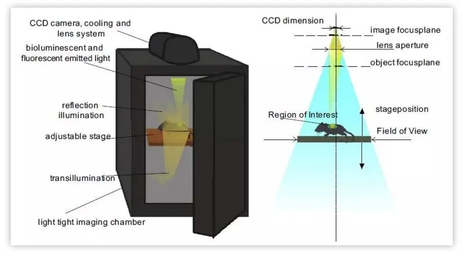 6. 活體成像:動(dòng)物經(jīng)麻醉(氣麻/針麻)后放入成像暗箱平臺(tái),開(kāi)啟照明燈(明場(chǎng))拍攝背景圖。關(guān)閉照明燈,在沒(méi)有外界光源的條件下(暗場(chǎng))拍攝由小鼠體內(nèi)發(fā)出的特異性光子。明場(chǎng)與暗場(chǎng)的背景圖疊加后可以直觀的顯示動(dòng)物體內(nèi)特異光子的部位和強(qiáng)度,完成成像操作。值得注意的是熒光成像需要選擇合適的激發(fā)光和發(fā)射光濾光片,生物發(fā)光則需要成像前注射luciferase底物。