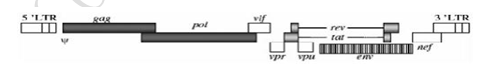 HIV-1為雙鏈RNA病毒,共有9個基因,如圖1所示。gag、pol、env3個基因編碼病毒的基本結(jié)構,tat、rev為調(diào)節(jié)基因,vif、vpr、vpu、nef 4個為輔助基因。其中,gag基因編碼病毒的核心蛋白,包括基質(zhì)蛋白、衣殼蛋白、核衣殼蛋白;pol基因編碼病毒復制所需的酶,如反轉(zhuǎn)錄酶、整合酶、蛋白酶,env基因編碼病毒的包膜糖蛋白,決定病毒感染宿主的靶向性。rev編碼的蛋白調(diào)節(jié)gag、pol、env的表達水平,tat編碼的蛋白參與RNA轉(zhuǎn)錄的控制。4個輔助基因編碼的蛋白則作為毒力因子參與宿主細胞的識別和感染。兩端為長末端重復序列(LTR),內(nèi)含復制所需的順式作用元件,如包裝信號元件Ψ。