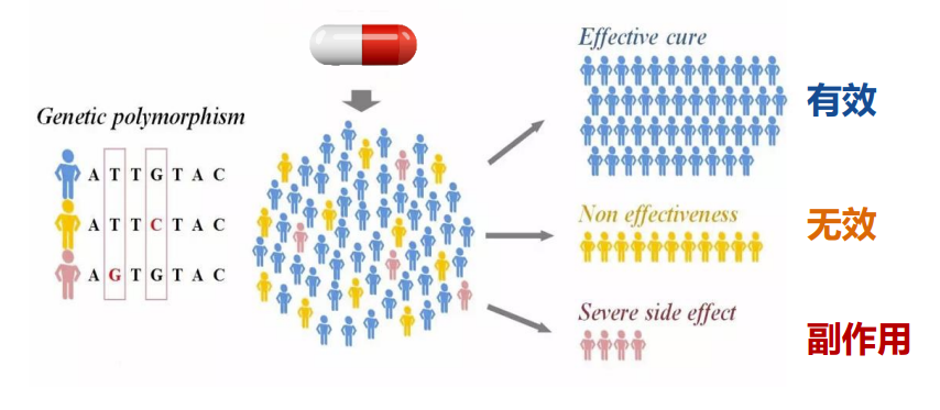圖1:基因多態(tài)性導致藥物的個體化差異(相同病癥、相同藥物、相同劑量、不同藥效)