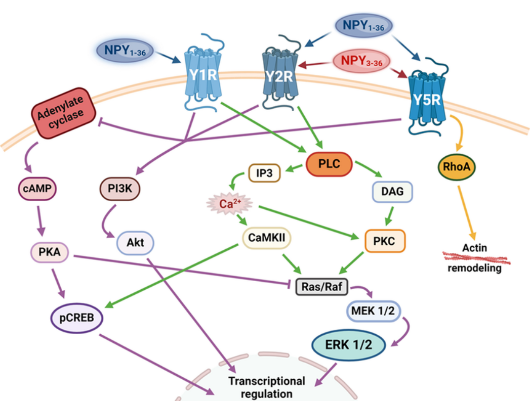 在人類中,NPY主要通過三種GPCR- Y1R、Y2R和Y5R起作用。Y1R需要全長NPY1-36才能激活,而Y2R和Y5R也可以結(jié)合NPY3-36。所有NPY受體通過Gi/o蛋白發(fā)出信號,并通過腺苷酸環(huán)化酶抑制cAMP合成,從而阻斷PKA對下游通路的抑制作用。NPY信號傳導(dǎo)的第二種機制是針對Y1R和Y2R的,涉及Ca 2 +的動員以及隨后PKC和CaMKII的鈣依賴性激活。同時,這些信號通路導(dǎo)致ERK1/2的激活。此外,所有NPY受體都能夠激活PI3K/Akt通路。Y5R的具體特征是能夠激活RhoA,從而調(diào)節(jié)細胞骨架重塑。