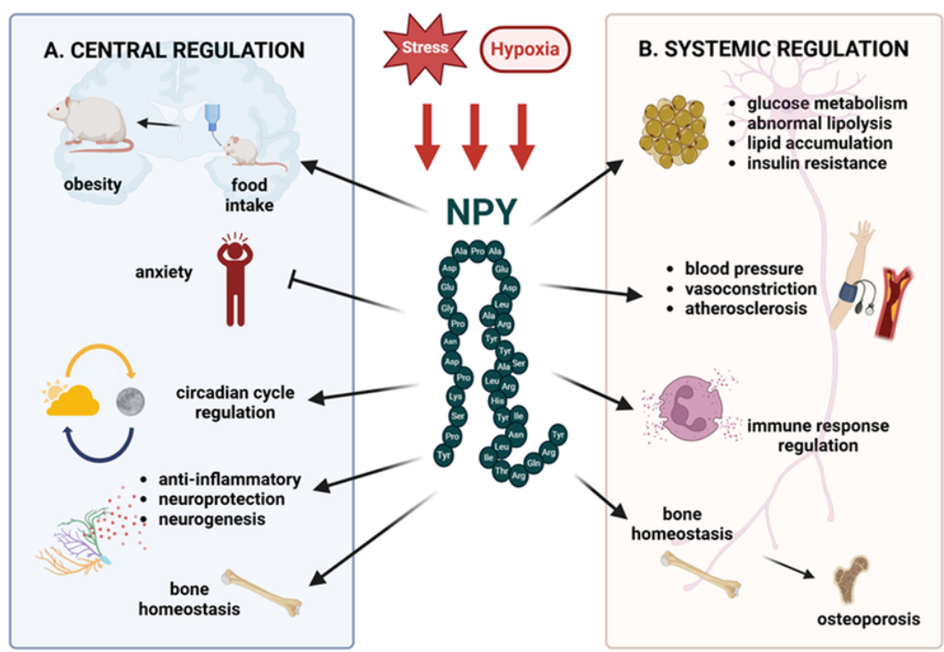 NPY受體被一個結(jié)構(gòu)相關(guān)的富含酪氨酸的多肽家族激活,即NPY(神經(jīng)肽Y),PYY(肽酪氨酸-酪氨酸)和PP(胰腺多肽),它們具有36個氨基酸的共同長度和一個修飾的C段。NPY是中樞和周圍神經(jīng)系統(tǒng)中最豐富的肽之一,在能量穩(wěn)態(tài)中起著重要作用。NPY參與應(yīng)激反應(yīng)、食欲刺激、晝夜節(jié)律、免疫和骨骼穩(wěn)態(tài)等過程的中樞調(diào)節(jié)。在外周,NPY與去甲腎上腺素共同從交感神經(jīng)元釋放,影響代謝、心血管系統(tǒng)、骨骼健康和免疫反應(yīng)。盡管NPY的表達和釋放在很大程度上與交感神經(jīng)系統(tǒng)活性相關(guān),但現(xiàn)在已知幾種細胞對NPY有反應(yīng),NPY系統(tǒng)的失調(diào)與幾種病理狀況有關(guān),包括肥胖、心血管疾病、糖尿病和胰島素抵抗,這些狀況也經(jīng)常伴有蛋白尿和CKD。