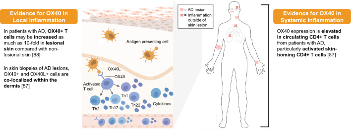 有研究證明OX40通路的激活參與了AD患者的全身和局部炎癥(如下圖所示)。雖然OX40L的表達(dá)(主要是單核細(xì)胞)在AD患者和健康對(duì)照組之間沒有差異,但在AD患者循環(huán)CD4+ T細(xì)胞中OX40的表達(dá)升高。在AD患者的外周血中,活化的CD4+ T細(xì)胞上OX40的表達(dá)比未表達(dá)抗原的活化CD4+ T細(xì)胞上OX40的表達(dá)增加。AD患者病變皮膚中OX40+細(xì)胞(可能是T細(xì)胞)和OX40L+樹突狀細(xì)胞的數(shù)量比銀屑病和非病變皮膚多。一項(xiàng)研究表明,在AD患者中,皮損皮膚中OX40+ T細(xì)胞比非皮損皮膚增加了10倍之多。在AD病變的皮膚活檢中,發(fā)現(xiàn)OX40+真皮細(xì)胞和OX40L+細(xì)胞(可能是肥大細(xì)胞)在真皮內(nèi)共定位,在角質(zhì)形成細(xì)胞上可見OX40L的表達(dá),提示OX40信號(hào)的局部活性。