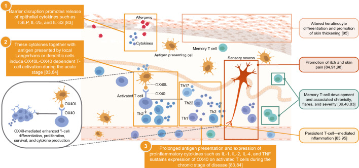 雖然目前對(duì)特應(yīng)性皮炎(AD)的具體情況知之甚少,但OX40可能在特應(yīng)性皮炎(AD)發(fā)展的幾個(gè)階段都很重要。在特應(yīng)性皮炎(AD)的急性期,OX40信號(hào)可能參與了Th2型 T細(xì)胞驅(qū)動(dòng)的炎癥,放大了皮膚屏障的破壞和瘙癢等癥狀的發(fā)展。在早期發(fā)病過程中,朗格漢斯細(xì)胞和炎性樹突狀表皮細(xì)胞識(shí)別通過被破壞的表皮屏障穿透皮膚的外來抗原,隨后啟動(dòng)Th2細(xì)胞。屏障破壞的角質(zhì)形成細(xì)胞也可以產(chǎn)生細(xì)胞因子,如胸腺基質(zhì)淋巴生成素(TSLP)、IL-25和IL-33。由于這些分子已被證明可以刺激APC表達(dá)OX40L,這可以通過增強(qiáng)傳遞給T細(xì)胞的OX40信號(hào)來進(jìn)一步增強(qiáng)T細(xì)胞的擴(kuò)增和分化。同樣,OX40L也被發(fā)現(xiàn)可以誘導(dǎo)ILC2,而ILC2也受這些先天細(xì)胞因子的調(diào)節(jié),ILC2和T細(xì)胞之間涉及OX40L和OX40的相互作用也可能有助于Th2細(xì)胞的初始啟動(dòng)。激活的Th2細(xì)胞上調(diào)IL-14、IL-13和IL-31的產(chǎn)生,進(jìn)而通過抑制屏障相關(guān)基因(如角化細(xì)胞終末分化基因聚絲蛋白)的表達(dá)破壞表皮屏障功能,促進(jìn)表皮增生。IL-4和IL-13結(jié)合在T細(xì)胞、B細(xì)胞、巨噬細(xì)胞和其他免疫細(xì)胞上表達(dá)的IL-4Rα,促進(jìn)炎癥和免疫球蛋白E類轉(zhuǎn)換。感覺神經(jīng)元表達(dá)皮膚細(xì)胞和免疫細(xì)胞釋放的各種細(xì)胞因子的受體,包括IL-4、IL-13、IL-31和TSLP,將瘙癢和疼痛信號(hào)傳遞到中樞神經(jīng)系統(tǒng),引起特應(yīng)性瘙癢、疼痛和抓撓。