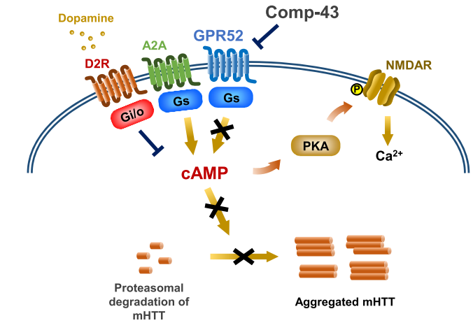 還有文獻(xiàn)報(bào)道關(guān)于用于治療亨廷頓病的 GPR52 信號(hào)傳導(dǎo)模型。在紋狀體中,GPR52 在表達(dá)多巴胺 D2 和腺苷 A2a 受體的紋狀體蒼白球神經(jīng)元中表達(dá)。GPR52 拮抗劑 Comp-43 會(huì)導(dǎo)致突變亨廷頓蛋白(mHTT)的蛋白酶體降解。相反,通過增加細(xì)胞內(nèi) cAMP 激活 GPR52 會(huì)將 mHTT 運(yùn)輸?shù)絻?nèi)質(zhì)網(wǎng)并防止其降解。GPR52 調(diào)節(jié)多巴胺能和谷氨酸能傳遞,并通過 NMDA 受體控制運(yùn)動(dòng)行為以及精神癥狀。