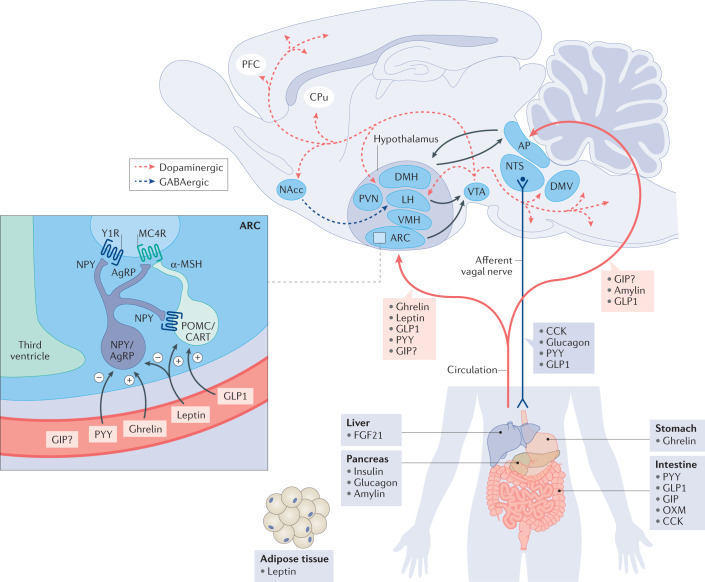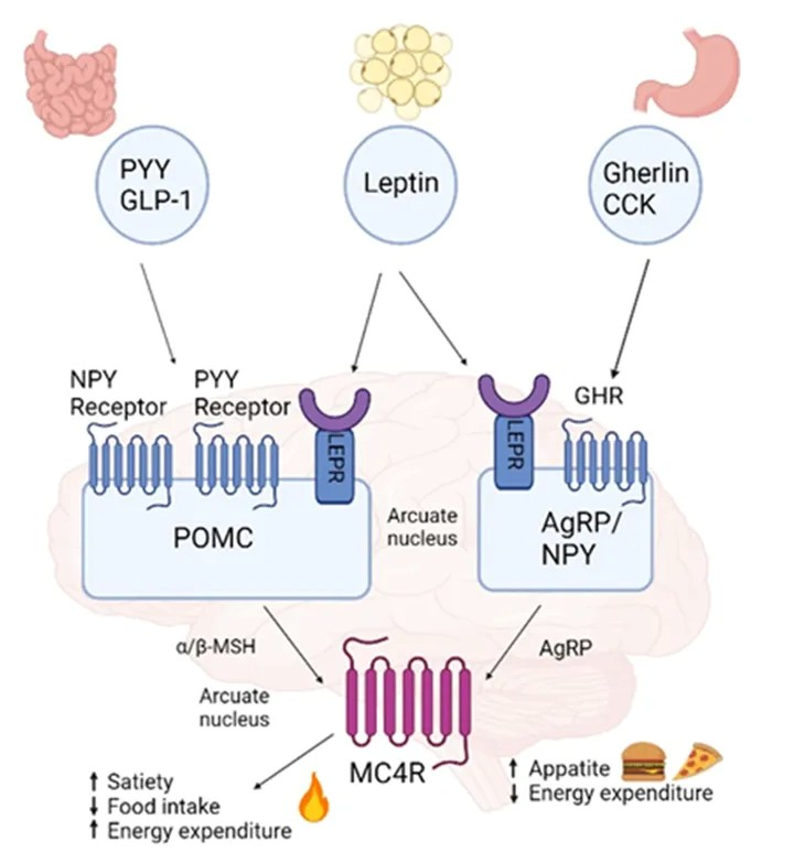 MC4R (黑皮質(zhì)素4受體) 是黑皮質(zhì)素受體家族成員之一,其家族屬于視紫紅質(zhì)樣A類GPCR,成員還包括:MC1R、MC2R、MC3R和MC5R。黑皮質(zhì)素受體 (MC1R-MC5R) 位于多種細胞類型上,并遍布大多數(shù)身體系統(tǒng)。MC4R是中樞黑皮質(zhì)素系統(tǒng)的重要組成部分,主要在下丘腦室旁核(PVH)中表達,是一種A類GPCR。在高能量平衡狀態(tài)下,阿片黑皮質(zhì)素原 (POMC) 神經(jīng)元釋放多肽MC4R激動劑-α-黑素細胞刺激激素(α-MSH)。α- MSH與MC4R結合會激活MC4R信號傳導,抑制食欲和食物攝入。在低能量平衡狀態(tài)下,下丘腦室旁核中釋放AgRP (agouti-related peptide)。AgRP作為MC4R與α- MSH結合的競爭性拮抗劑,也是MC4R反向激動劑,抑制MC4R信號傳導。